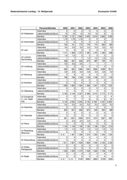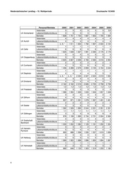 Niedersächsischer Landtag – 15. Wahlperiode Drucksache 15/3459 Personal/Betriebe 2000 2001 2002 2003 2004 2005 2006 Veterinäre 3 3 3 3 3 3 3,5 LK Ammerland Lebensmittelkontrolleure 3 3 3 3 3 3 3 Betriebe 1 828 1 751 1 703 1 687 1 652 1 705 1 694 Veterinäre 4 4 4 4 4 4 4 LK Aurich Lebensmittelkontrolleure 4 4 4 4 4 4 4 Betriebe k. A. * 1 511 1 602 1 792 1 907 2 022 2 104 Veterinäre 1 1 1 1 1 1 1 LK Celle Lebensmittelkontrolleure 6 6 6 6 6 6 6 Betriebe 1 625 1 648 1 627 1 991 2 265 2 176 2 176 Veterinäre 5 5 5 5 5 5 5 LK Cloppenburg Lebensmittelkontrolleure 3 3 3 3 3 3 3 Betriebe 2 825 2 827 2 659 2 783 2 583 3 016 2 954 Veterinäre 2 2 2 2 2 2 2 LK Cuxhaven Lebensmittelkontrolleure 4 5 5 6 6 6 6 Betriebe 1 456 2 289 2 976 2 859 3 155 3 154 3 043 Veterinäre 1 1 1 1 1 1 1 LK Diepholz Lebensmittelkontrolleure 4 4 4 4 3 3 3 Betriebe k. A. * k. A. * 2 033 2 027 2 023 2 019 1 933 Veterinäre 4 4 4 4 4 5 5 LK Emsland Lebensmittelkontrolleure 4 4 4 4 4 4 4 Betriebe 2 162 2 162 2 319 2 606 2 705 2 758 2 758 Veterinäre 1,2 1,2 1,2 1,2 1,2 1,2 1,2 LK Friesland Lebensmittelkontrolleure 3 3 3 3 3 3 3 Betriebe 1 586 1 594 1 626 1 633 1 646 1 657 1 648 Veterinäre 3 3 3 3 3 3 3 LK Gifhorn Lebensmittelkontrolleure 4 4 4 4 4 4 4 Betriebe 937 971 1 351 1 279 1 357 1 401 1 401 Veterinäre 2 2 2 2 2 2 2 LK Goslar Lebensmittelkontrolleure 3 3 5 5 5 5 5 Betriebe 1 582 1 526 1 890 2 044 2 251 2 351 2 351 Veterinäre 1,1 1,1 1,1 1,1 1,1 1,1 1,1 LK Göttingen Lebensmittelkontrolleure 3 3 5 9 9 9 8 Betriebe 978 1 199 1 895 2 734 2 721 2 504 2 563 Veterinäre 4 4 4 4 4 4 4 LK Grafschaft Lebensmittelkontrolleure 1 2 3 3 3 3 3 Bentheim Betriebe 1 030 1 052 1 082 1 129 1 191 1 250 1 324 Veterinäre 3 3 3 2 2 2 2 LK Hameln- Lebensmittelkontrolleure 5 5 4 4 4 4 4 Pyrmont Betriebe 693 688 1 506 1 535 1 537 1 619 1 658 Veterinäre 3 3 3 3 3 3 3 LK Harburg Lebensmittelkontrolleure 5 5 5 5 5 5 5 Betriebe 1 969 1 922 1 888 1 896 1 850 1 894 1 897 Veterinäre 1 1 1 1 1 1 1 LK Helmstedt Lebensmittelkontrolleure 2 2 3 3 3 3 3 Betriebe 682 646 1 133 1 303 1 319 1 233 1 183 4
