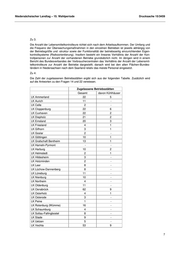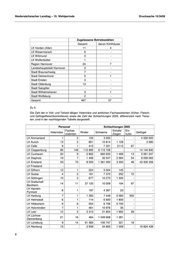 Niedersächsischer Landtag – 15. Wahlperiode Drucksache 15/3459 Zu 3. Die Anzahl der Lebensmittelkontrolleure richtet sich nach dem Arbeitsaufkommen. Der Umfang und die Frequenz der Überwachungsmaßnahmen in den einzelnen Betrieben ist jeweils abhängig von der Betriebsgröße und -struktur sowie der Funktionalität der betriebsseitig einzurichtenden Eigen- kontrollsysteme (Risikoorientierung). Insofern besteht ein lineares Verhältnis der Anzahl der Kon- trollpersonen zur Anzahl der vorhandenen Betriebe grundsätzlich nicht. Im übrigen wird in einem Bericht des Bundesverbandes der Verbraucherzentralen das Verhältnis der Anzahl der Lebensmit- telkontrolleure zur Anzahl der Betriebe dargestellt; danach wird bei den alten Flächen-Bundes- ländern in Niedersachsen nach dem Saarland relativ das meiste Personal eingesetzt. Zu 4: Die Zahl der zugelassenen Betriebsstätten ergibt sich aus der folgenden Tabelle. Zusätzlich wird auf die Antworten zu den Fragen 14 und 22 verwiesen. Zugelassene Betriebsstätten Gesamt davon Kühlhäuser LK Ammerland 22 5 LK Aurich 11 - LK Celle 2 - LK Cloppenburg 22 6 LK Cuxhaven 22 2 LK Diepholz 21 2 LK Emsland 20 3 LK Friesland 4 1 LK Gifhorn 3 1 LK Goslar 2 - LK Göttingen 10 1 LK Grafschaft Bentheim 13 1 LK Hameln-Pyrmont - - LK Harburg 10 2 LK Helmstedt 2 1 LK Hildesheim 3 - LK Holzminden 2 - LK Leer 8 - LK Lüchow-Dannenberg 8 - LK Lüneburg 11 - LK Nienburg 10 - LK Northeim 4 - LK Oldenburg 11 - LK Osnabrück 62 9 LK Osterholz 4 1 LK Osterode 3 - LK Peine 1 - LK Rotenburg (Wümme) 16 - LK Schaumburg 4 - LK Soltau-Fallingbostel 8 - LK Stade 9 - LK Uelzen 5 - LK Vechta 53 9 7