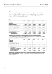 Niedersächsischer Landtag – 16. Wahlperiode Drucksache 16/5130 Zu 3: Die aktuell geltenden Regelungen zum bundesstaatlichen Finanzausgleich und der Solidarpakt II sind bis Ende 2019 befristet. Zur Gewährleistung der notwendigen Planungssicherheit wurde bei Einführung dieser Regeln (Solidarpaktfortführungsgesetz vom 20.12.2001 mit Wirkung ab 2005) vereinbart, das System während dieses Zeitraums unverändert zu lassen. Daran sollte nach dem Grundsatz „pacta sunt servanda“ festgehalten werden. Zu 4: Jahr 2007 2008 2009 2010 2011 in Mio. Euro Bundesweit Länderfinanzausgleich 7 916,5 8 263,4 6 847,8 7 038,6 7 308,2 Umsatzsteuerausgleich gesamt 73 840,5 76 306,9 78 058,5 80 587,9 83 807,4 davon Ergänzungsanteile § 2 I FAG 12 684,3 12 856,0 10 880,5 10 092,0 11 014,8 Verteilung nach Einwohnern § 2 II FAG 61 156,2 63 450,9 67 178,0 70 495,8 72 792,6 Bundesergänzungszuweisungen 14 823,6 14 783,5 13 533,1 12 883,8 12 170,0 davon allgemeine BEZ 2 927,4 3 040,8 2 506,2 2 623,8 2 625,8 Sonderbedarfs-BEZ 11 896,1 11 742,8 11 026,9 10 260,0 9 544,2 Quelle für Länderfinanzausgleich, Umsatzsteuerausgleich, Bundesergänzungszuweisungen: 2. Verordnung zur Durchführung des Finanzausgleichsgesetzes (2007-2010), Vorläufige Abrechnung der Umsatzsteuerverteilung u. d. Finanzausgleichs BMF (2011). Jahr 2007 2008 2009 2010 2011 in Mio. Euro Bundesweit Kompensationszahlungen und Finanzhilfen Artikel 143 c GG: • Ausbau und Neubau von Hoch- 695,3 695,3 695,3 695,3 695,3 schulen • Bildungsplanung 19,9 19,9 19,9 19,9 19,9 • Verbesserung der Verkehrsver- 1 335,5 1 335,5 1 335,5 1 335,5 1 335,5 hältnisse der Gemeinden • Wohnraumförderung 518,2 518,2 518,2 518,2 518,2 Quelle für Mittel, die der Bund den Ländern aus der Kompensation für abgeschaffte Gemeinschaftsaufga- ben zur Verfügung gestellt hat: Gesetz zur Entflechtung von Gemeinschaftsaufgaben und Finanzhilfen (Entflechtungsgesetz). 8