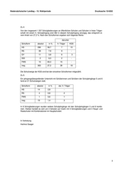 Niedersächsischer Landtag – 15. Wahlperiode Drucksache 15/4202 Zu 4: Von den insgesamt 1 337 Schulgliederungen an öffentlichen Schulen und Schulen in freier Träger- schaft mit einem 5. Schuljahrgang sind 362 in diesem Schuljahrgang einzügig; das entspricht ei- nem Anteil von 27,2 %. Nach den Schulformen ergeben sich folgende Werte: darunter Schulform absolut in % fr. Träger KGS HS 296 58,7 7 15 RS 39 7,9 9 - GY 11 3,8 6 3 IGS 2 6,3 2 - FWS 15 83,3 15 - insg. 363 27,2 39 18 Die Schulzweige der KGS sind bei den einzelnen Schulformen mitgezählt. Zu 5: Ein jahrgangsübergreifender Unterricht mit Schülerinnen und Schülern der Schuljahrgänge 5 und 6 fand an 21 Schulzweigen statt. Schulform absolut in % dar. fr. Träger HS 14 2,8 - RS 4 0,8 2 FWS 1 5,6 1 insg. 19 1,4 3 In 8 Schulgliederungen wurden weitere Schuljahrgänge mit den Schuljahrgängen 5 und 6 kombi- niert. Hierbei handelt es sich um 3 Schulen auf Inseln mit 5 Schulgliederungen und 3 Haupt- und Realschulen mit Kombinationen im Hauptschulteil. In Vertretung Hartmut Saager 3