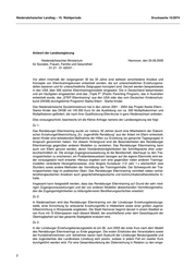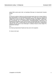 Niedersächsischer Landtag – 15. Wahlperiode Drucksache 15/2074 setzten Mitteln werden jedoch mittel- und langfristige Erfahrungen mit entsprechender Evaluation benötigt. Zu 4: Auf Grund der erwähnten Vielfalt bei den Elterntrainingskonzepten haben die auf diesem Gebiet tä- tigen Beratungsstellen und Erziehungshilfeeinrichtungen in der Regel schon eine Positionierung vorgenommen und sich für eines der in Deutschland bekannten und eingeführten Modelle ent- schieden. Hinzu kommen die Elternkurse im Rahmen des Projekts Starke Eltern - Starke Kinder, die in Einrichtungen wie z. B. Volkshochschulen, Familienbildungsstätten, Mütterzentren und Stadtteilzentren durchgeführt werden und sich an Eltern mit Kindern jeden Alters und aus allen so- zialen Schichten richten. In welcher Weise sich das Rendsburger Elterntraining in Niedersachsen verbreitet, wird nicht zuletzt von den Erfahrungen in Lüneburg, Hannover und den übrigen Pro- jektstandorten abhängen. Zu 5: Die Förderung entsprechender Projekte durch das Land ist nicht vorgesehen. Dr. Ursula von der Leyen (Ausgegeben am 24.06.2205) 3