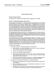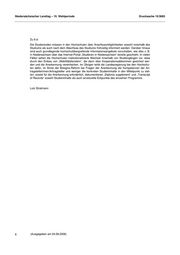 Niedersächsischer Landtag − 15. Wahlperiode Drucksache 15/3083 Kleine Anfrage mit Antwort Wortlaut der Kleinen Anfrage der Abgeordneten Dr. Gabriele +HLQHQ.OMDMLü *5h1( HLQJHJDQJHQDP Bachelor- und Masterstudiengänge in Niedersachsen Wissenschaftsminister Stratmann hat in mehreren Plenarsitzungen dargelegt, dass die Umstellung der Studiengänge auf die Bachelor- und Masterabschlüsse in Niedersachsen sehr weit vorange- kommen sei. Darüber hinaus hat Minister Stratmann erklärt: „In Niedersachsen wird bei der Um- stellung der bisherigen Diplom-, Magister- und Staatsexamensstudiengänge auf die neuen Bache- lor- und Masterstudiengänge darauf geachtet, dass keine Verminderung der Absolventenzahlen eintritt“ (74. Plenarsitzung, 10.11.005). Am 23.02.2006 in der 83. Plenarsitzung erklärte der Wis- senschaftsminister: „Der Kollege Dr. Zielke hat Recht, wenn er sagt, die neuen Bologna-Strukturen, die bei uns in Niedersachsen übrigens viel früher eingeführt sein werden als in anderen Ländern, werden dazu beitragen, dass wir freie Kapazitäten bekommen.“ Die Hochschulrektorenkonferenz (HRK) hat in ihrer Entschließung vom 23. November letzten Jah- res festgestellt, dass die Umstellung auf Bachelor- und Masterstudiengänge zwar eine Verkürzung der tatsächlichen Studiendauer auf die Regelstudienzeit erwarten lässt, dies jedoch eine bessere Betreuung der Studierenden voraussetzt. Die Bologna-Reform bietet daher keine Personalreserve zur Bewältigung des Studentenberges. Die Bundesvereinigung der Deutschen Arbeitgeberverbände (BDA) hat Erwartungen und Forde- rungen an Politik und Hochschulen bezüglich der Umstellung auf Bachelor- und Masterstudiengän- ge formuliert. Danach erwartet die Wirtschaft eine schnellere und konsequentere Umstellung auf die gestufte Studienstruktur, bei der grundsätzlich jeder Bachelorabschluss zur Aufnahme einer Be- rufstätigkeit qualifizieren muss. „Die Umstellung muss für eine Erneuerung der Lehrinhalte und Lernformen genutzt werden, mit dem Ziel, die Studienzeiten zu verkürzen und die Studienqualität zu steigern“ (BDA, More Bachelors and Masters Welcome, 30.05.2006). Ich frage die Landesregierung: 1. Einrichtung von Bachelor- und Masterstudiengängen in Niedersachsen: a) Welche Bachelor- und Masterstudiengänge sind seit wann an welchen niedersächsi- schen Hochschulen/Akademien eingerichtet worden? b) Wie hoch ist die jeweilige Anzahl der Studienplätze? c) Wie lang sind die jeweiligen Regelstudienzeiten? d) Welche anderen Regelstudienzeiten nach § 6 Abs. 3 Satz 4 des Niedersächsischen Hochschulgesetzes gibt es bisher, bzw. mit wie vielen Ausnahmen rechnet die Landes- regierung bei der weiteren Umstellung? e) Wie hat sich aufgrund der Einführung von Bachelor- und Masterstudiengängen die Stu- dienplatzkapazität an den jeweiligen niedersächsischen Hochschulen entwickelt? 2. Berufschancen für die Absolventen der Bachelor- und Masterstudiengänge: a) Wie beurteilt die Landesregierung die Forderung der BDA bezüglich der Qualität der Ba- chelorausbildung? b) Welche Studienabschlüsse setzt sie im niedersächsischen Landesdienst für eine Ein- stellung in den höheren Dienst voraus? c) Wie begegnet sie den Vorwürfen von einigen Berufsverbänden, beispielsweise Ingenieu- ren und Juristen, der Bachelorabschluss könne nicht berufsqualifizierend sein? 1