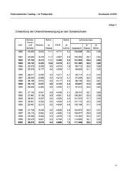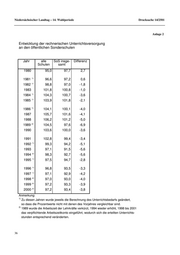 Niedersächsischer Landtag – 14. Wahlperiode Drucksache 14/2501 Anlage 2 Entwicklung der rechnerischen Unterrichtsversorgung an den öffentlichen Sonderschulen Jahr alle SoS insge- Differenz Schulen samt 1980 95,0 97,7 2,7 1) 1981 96,6 97,2 0,6 1) 1982 98,8 97,0 -1,8 1983 101,8 100,8 -1,0 1) 1984 104,3 100,7 -3,6 1) 1985 103,9 101,8 -2,1 1) 1986 104,1 100,1 -4,0 1987 105,7 101,6 -4,1 1988 106,2 101,2 -5,0 2) 1989 104,5 97,6 -6,9 1990 103,6 100,0 -3,6 1991 102,8 99,4 -3,4 1) 1992 99,3 94,2 -5,1 1993 97,1 91,5 -5,6 2) 1994 98,3 92,7 -5,6 1) 1995 97,5 94,7 -2,8 1) 1996 96,8 93,5 -3,3 1) 1997 97,1 92,9 -4,2 2) 1998 97,0 93,0 -4,0 2) 1999 97,2 93,3 -3,9 2) 2000 97,2 93,4 -3,8 Anmerkung: 1) Zu diesen Jahren wurde jeweils die Berechnung des Unterrichtsbedarfs geändert, so dass die Prozentwerte nicht mit denen des Vorjahres vergleichbar sind. 2) 1989 wurde die Arbeitszeit der Lehrkräfte verkürzt, 1994 wieder erhöht, 1998 bis 2001 das verpflichtende Arbeitszeitkonto eingeführt, wodurch sich die erteilten Unterrichts- stunden entsprechend veränderten. 36