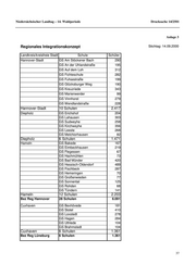 Niedersächsischer Landtag – 14. Wahlperiode Drucksache 14/2501 Anlage 3 Regionales Integrationskonzept Stichtag: 14.09.2000 Landkreis/kreisfreie Stadt Schule Schüler Hannover-Stadt GS Am Stöckener Bach 290 GS An der Uhlandstraße 195 GS Auf dem Loh 312 GS Fichteschule 282 GS Fuhsestraße 199 GS Glücksburger Weg 190 GS Kreuzriede 343 GS Marienwerder 99 GS Vinnhorst 279 GS Wendlandstraße 228 Hannover-Stadt 10 Schulen 2.417 Diepholz GS Erichshof 204 GS Lahausen 303 GS Sudweyhe 258 GS Kirchweyhe 356 GS Leeste 268 GS Melchiorhausen 82 Diepholz 6 Schulen 1.471 Hameln GS Bakede 167 GS Eimbeckhausen 219 GS Flegessen 67 GS Hachmühlen 73 GS Bad Münder 420 GS Hessisch-Oldendorf 489 GS Fischbeck 287 GS Hemeringen 70 GS Großenwieden 77 GS Sonnental 125 GS Rohden 68 GS Tündern 141 Hameln 12 Schulen 2.203 Bez Reg Hannover 28 Schulen 6.091 Cuxhaven GS Bexhövede 181 GS Stotel 410 GS Loxstedt 278 GS Hagen 284 GS Uthlede 104 GS Brahmstedt 104 Cuxhaven 6 Schulen 1.361 Bez Reg Lüneburg 6 Schulen 1.361 37