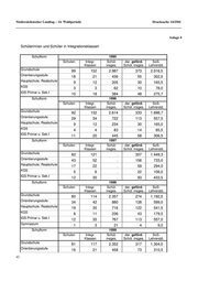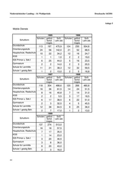 Niedersächsischer Landtag – 14. Wahlperiode Drucksache 14/2501 Anlage 5 Mobile Dienste 1995 1996 Schulen geförd. SoS- Schulen geförd. SoS- Schulform Schül. Lehr.std. Schül. Lehr.std. insges. insges. Grundschule 113 197 475,9 124 230 504,8 Orientierungsstufe 24 56 142,0 21 52 88,5 Hauptschule, Realschule 10 22 34,2 12 16 24,7 KGS 1 1 1,0 2 2 19,0 IGS Primar u. Sek.I 6 25 44,0 5 16 23,5 Gymnasium 2 2 14,0 2 3 20,5 Schule für Lernhilfe 11 21 38,3 12 32 59,5 Schule f. geistig Beh. 1 2 13,0 2 5 16,8 1997 1998 Schulen geförd. SoS- Schulen geförd. SoS- Schulform Schül. Lehr.std. Schül. Lehr.std. insges. insges. Grundschule 118 304 488,6 120 266 480,8 Orientierungsstufe 16 36 61,5 14 24 51,5 Hauptschule, Realschule 8 16 40,8 7 14 31,0 KGS 2 2 5,5 3 17 18,5 IGS Primar u. Sek.I 6 17 38,5 6 22 51,0 Gymnasium 2 3 32,5 4 5 45,5 Schule für Lernhilfe 12 38 64,5 9 25 36,0 Schule f. geistig Beh. 2 7 17,0 1 2 13,0 1999 Schulen geförd. SoS- Schulform Schül. Lehr.std. insges. Grundschule 137 274 513,0 Orientierungsstufe 16 18 57,5 Hauptschule, Realschule 7 17 35,5 KGS 1 14 23,0 IGS Primar u. Sek.I 3 20 30,5 Gymnasium 3 8 36,0 Schule für Lernhilfe 8 20 43,0 Schule f. geistig Beh. 2 3 16,0 44