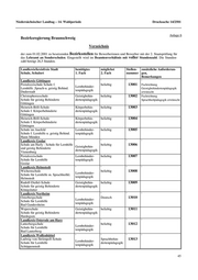 Niedersächsischer Landtag – 14. Wahlperiode Drucksache 14/2501 Anlage 6 Bezirksregierung Braunschweig Verzeichnis der zum 01.02.2001 zu besetzenden Bezirksstellen für Bewerberinnen und Bewerber mit der 2. Staatsprüfung für das Lehramt an Sonderschulen. Eingestellt wird im Beamtenverhältnis mit voller Stundenzahl. Die Stunden- zahl beträgt 26,5 Stunden. Landkreis/kreisfreie Stadt benötigtes möglichst Stellen- zusätzliche Anforderun- Schule, Schulort 1. Fach 2. Fach nummer gen, Bemerkungen Landkreis Göttingen ' ' ' ' Pestalozzischule Schule f. beliebig 13001 Fachrichtung Lernbehinder- Lernhilfe ,Sprach-u. geistig Behind. Geistigbehindertenpädagogik Duderstadt tenpädagogik erwünscht Christophorusschule Geistigbehin- beliebig 13002 Fachrichtung Schule für geistig Behinderte dertenpädagogik Sprachheilpädagogik erwünscht Göttingen Heinrich-Böll-Schule Körperbehin- beliebig 13003 Schule f. Körperbehinderte dertenpädagogik Göttingen Heinrich-Böll-Schule Körperbehin- beliebig 13004 Schule f. Körperbehinderte dertenpädagogik Göttingen Schule im Auefeld Lernbehinder- beliebig 13005 Schule f. Lernhilfe u. geistig Behind. tenpädagogik Hann Münden Landkreis Goslar ' ' ' ' Schule am Harly - Schule für Lernhilfe beliebig 13006 und geistig Behinderte Geistigbehin- dertenpädagogik Vienenburg Pestalozzischule Lernbehinder- beliebig 13007 Schule für Lernhilfe tenpädagogik Goslar Landkreis Helmstedt ' ' ' ' Wichernschule beliebig 13008 Lernbehinder- Schule für Lernhilfe m. Sprachheilkl. Helmstedt tenpädagogik Rudolf-Dießel-Schule Geistigbehin- beliebig 13009 Schule für geistig Behinderte dertenpädagogik Königslutter Landkreis Northeim ' ' ' ' Osterbergschule Deutsch 13010 Schule für Lernhilfe Lernbehinder- tenpädagogik Bad Gandersheim Weperschule Geistigbehin- beliebig 13011 Schule für geistig Behinderte dertenpädagogik Hardegsen Landkreis Osterode am Harz ' ' ' ' Lutterbergschule beliebig 13012 Lernbehinder- Schule für Lernhilfe Bad Lauterberg tenpädagogik Landkreis Wolfenbüttel ' ' ' ' Ludwig-von-Strümpell-Schule Sprachbehin- 13013 Lernbehinder- Schule für Lernhilfe dertenpädagogik tenpädagogik Schöppenstedt 45