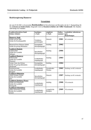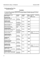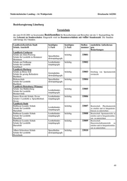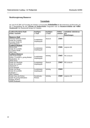 Niedersächsischer Landtag – 14. Wahlperiode Drucksache 14/2501 Bezirksregierung Lüneburg Verzeichnis der zum 01.02.2001 zu besetzenden Bezirksstellen für Bewerberinnen und Bewerber mit der 2. Staatsprüfung für das Lehramt an Sonderschulen. Eingestellt wird im Beamtenverhältnis mit voller Stundenzahl. Die Stunden- zahl beträgt 26,5 Stunden. Landkreis/kreisfreie Stadt benötigtes benötigtes Stellen- zusätzliche Anforderun- Schule, Anschrift 1. Fach 2. Fach nummer gen, Bemerkungen Landkreis Cuxhaven ' ' ' ' Schule am Alten Postweg beliebig 33001 Sprachbehin- Schule für Lernhilfe in Hemmoor dertenpädagogik Hemmoor Schule am Feldkamp Lernbehinder- beliebig 33002 Schule für Lernhilfe tenpädagogik Schiffdorf Landkreis Harburg ' ' ' ' Schule an Börns Soll beliebig 33003 Erteilung von Sportunterricht Geistigbehin- Schule für geistig Behinderte erwünscht Buchholz dertenpädagogik Birkenschule Sprachbehin- beliebig 33004 Schule für Lernhilfe dertenpädagogik Buchholz Landkreis Rotenburg (Wümme) ' ' ' ' Schule Am Mahlersberg beliebig 33005 Lernbehinder- Schule für Lernhilfe tenpädagogik Bremervörde Janusz-Korczak-Schule, Zeven Lernbehinder- beliebig 33006 Schule f. Lernhilfe u. Sprachbehind. tenpädagogik Zeven Landkreis Stade ' ' ' ' Balthasar-Leander-Schule beliebig 33007 Bereitschaft, Physikunterricht Lernbehinder- Schule für Lernhilfe zu erteilen und in Integrations- Harsefeld tenpädagogik klassen zu unterrichten Balthasar-Leander-Schule Lernbehinder- beliebig 33008 Bereitschaft, Sportunterricht zu Schule für Lernhilfe tenpädagogik erteilen und in Integrationsklas- Harsefeld sen zu unterrichten Balthasar-Leander-Schule Lernbehinder- beliebig 33009 Bereitschaft, Schule für Lernhilfe tenpädagogik Hauswirtschaftsunterricht zu Harsefeld erteilen und in Integrationsklas- sen zu unterrichten Albert-Schweitzer-Schule Sprachbehin- beliebig 33010 Schule für Lernhilfe dertenpädagogik Buxtehude 49