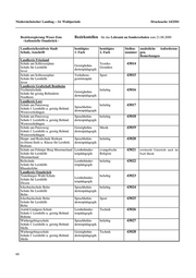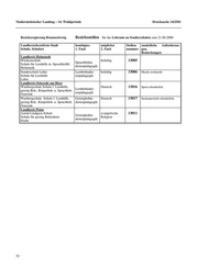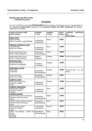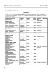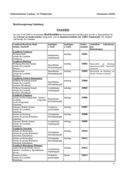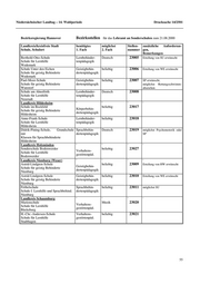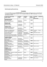 Niedersächsischer Landtag – 14. Wahlperiode Drucksache 14/2501 Bezirksregierung Lüneburg Verzeichnis der zum 21.08.2000 zu besetzenden Bezirksstellen für Bewerberinnen und Bewerber mit der 2. Staatsprüfung für das Lehramt an Sonderschulen. Eingestellt wird im Beamtenverhältnis mit voller Stundenzahl. Die Stunden- zahl beträgt 26,5 Stunden. Landkreis/kreisfreie Stadt benötigtes benötigtes Stellen- zusätzliche Anforderun- Schule, Anschrift 1. Fach 2. Fach nummer gen, Bemerkungen Landkreis Cuxhaven ' ' ' ' Wichernschule beliebig 33001 Sehbehinder- Schule für Lernhilfe tenpädagogik Cuxhaven Landkreis Harburg ' ' ' ' Wolfgang-Borchert-Schule beliebig 33002 Bereitschaft zur Erteilung Schule für Lernhilfe Sprachbehin- naturwissenschaftl. Unterrichts dertenpädagogik Winsen erwünscht Birkenschule Sprachbehin- beliebig 33003 Bereitschaft zur Erteilung von Schule für Lernhilfe dertenpädagogik Gestalt. Werken erwünscht Buchholz Landkreis Lüchow-Dannenberg ' ' ' ' Wilhelm-Warmbold-Schule beliebig 33004 Sprachbehin- Schule für Lernhilfe dertenpädagogik Lüchow (Wendland) Wilhelm-Warmbold-Schule Lernbehinder- beliebig 33005 Schule für Lernhilfe tenpädagogik Lüchow (Wendland) Landkreis Lüneburg ' ' ' ' Schule An Der Schaperdrift Schule f. beliebig 33006 Lernhilfe u.Sprachb. Körperbehin- dertenpädagogik m.Kl.f.Körperbeh. Lüneburg Johannes-Rabeler-Schule Verhaltens- beliebig 33007 Schule für Lernhilfe gestörtenpäd. Lüneburg Schule am Knieberg Geistigbehin- beliebig 33008 Schule für geistig Behinderte dertenpädagogik Lüneburg Johannes-Rabeler-Schule Lernbehinder- beliebig 33009 Schule für Lernhilfe tenpädagogik Lüneburg Landkreis Osterholz ' ' ' ' Schule am Klosterplatz beliebig 33010 Geistigbehin- Schule für geistig Behinderte Osterholz-Scharmbeck dertenpädagogik Schule am Klosterplatz Geistigbehin- beliebig 33011 Schule für geistig Behinderte dertenpädagogik Osterholz-Scharmbeck Landkreis Rotenburg (Wümme) ' ' ' ' Janusz-Korczak-Schule, Zeven beliebig 33012 Schule f. Lernhilfe u. Sprachbehind. Lernbehinder- tenpädagogik Zeven Pestalozzischule Verhaltens- Musik 33013 Schule für Lernhilfe gestörtenpäd. Rotenburg 57
