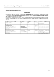 Niedersächsischer Landtag – 14. Wahlperiode Drucksache 14/2501 Bezirksregierung Hannover Verzeichnis der zum 21.08.2000 auf Vorschlag der Schulen zu besetzenden Schulstellen für Bewerberinnen und Bewerber mit der 2. Staatsprüfung für das Lehramt an Sonderschulen. Eingestellt wird im Beamtenverhältnis mit voller Stundenzahl. Die Stundenzahl beträgt 26,5 Stunden. Bewerberinnen und Bewerber mit einem älteren Wiederbewerbungsbogen ohne Schulstellenaufdruck tragen die Nummern der Schulstellen nach dem Schema des Bewerbungsbogens auf der Rückseite des Wiederbewerbungsbo- gens ein. Landkreis/kreisfreie Stadt benötigtes benötigtes Stellen- zusätzliche Anforderun- Schule, Anschrift 1. Fach 2. Fach nummer gen, Bemerkungen Landkreis Hameln-Pyrmont ' ' ' ' Albert-Schweitzer-Schule beliebig 23602 Mitarbeit im regionalen Inte- Sprachbehin- Schule für Lernhilfe grationskonzept erwünscht dertenpädagogik Süntelstr. 20 31785 Hameln Landkreis Hannover ' ' ' ' Gutzmannschule Kunst 23601 möglichst LB Sprachbehin- Schule f. Sprachbehinderte Konrad-Adenauer-Str. 41/43 dertenpädagogik 30853 Langenhagen Landkreis Hildesheim ' ' ' ' Sothenbergschule katholische 23603 möglichst DE Schule für Lernhilfe Sprachbehin- Religion dertenpädagogik Am Mühlenbusch 28 31162 Bad Salzdetfurth 56