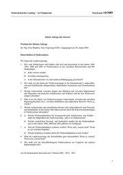 Niedersächsischer Landtag − 14. Wahlperiode Drucksache 14/3489 Kleine Anfrage mit Antwort Wortlaut der Kleinen Anfrage der Abg. Frau Mundlos, Frau Vogelsang (CDU), eingegangen am 30. Januar 2002 Sitzen bleiben in Niedersachsen Wir fragen die Landesregierung: 1. Wie viele Schülerinnen und Schüler sind (real und prozentual) in den Jahren 1990, 1995, 2000 und 2001 in Niedersachsen in den einzelnen Klassenstufen und Bil- dungsgängen a) nicht versetzt worden, b) freiwillig zurückgetreten, c) in der Sekundarstufe I in einen anderen Bildungsgang gewechselt? 2. Wie stellt sich die Quote der Nichtversetzungen in der Sekundarstufe I, aufgeschlüs- selt nach Schulformen (Hauptschulen, Realschulen, Gymnasien und Gesamtschulen) dar? 3. Welche Unterschiede zwischen Jungen und Mädchen und zwischen Migrantinnen und Migranten und deutschen Schülerinnen und Schülern sind bei den Nichtverset- zungen erkennbar? 4. Gibt es bei der Quote von Nichtversetzungen Unterschiede zwischen den einzelnen Regierungsbezirken bzw. zwischen ländlichem und städtischem Bereich? Wenn ja, welche? 5. Welche rechnerischen und tatsächlichen Kosten sind, aufgeschlüsselt nach Personal- und Sachmitteln, in den letzten fünf Jahren jeweils durch die Klassenwiederholungen in Niedersachsen entstanden? 6. a) Welche Fördermaßnahmen für leistungsschwache Schülerinnen und Schüler - außer der Möglichkeit der Nachversetzung - gibt es in Niedersachsen? b) Welche zusätzlichen Personal- und Sachmittel standen für die Fördermaßnah- men in den Jahren 1990, 2000 und 2001 jährlich zur Verfügung? 7 a) Sind die Fördermaßnahmen evaluiert worden? Wenn nein, warum nicht? Wenn ja, mit welchem Ergebnis? b) Welche Ergebnisse konnten durch die Fördermaßnahmen erzielt werden? 8. Plant die Landesregierung, das Sitzenbleiben ganz abzuschaffen? Wenn ja, warum? Wenn nein, warum nicht? 9. Wie stellt sich die Sitzenbleiberquote Niedersachsens im Vergleich mit anderen Bundesländern dar? (An die Staatskanzlei übersandt am 4. Februar 2002 – II/72 – 947) 1
