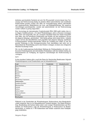 Niedersächsischer Landtag – 14. Wahlperiode Drucksache 14/3489 2. Förderstunden nach Förderkonzept 3. Sprachsonderunterricht an Grundschulen 4. Förderstunden für die Zusammenarbeit zwischen Grundschule und Sonderschulen 5. Sonderpädagogische Grundversorgung 6. Kleinlerngruppen an Orientierungsstufen 7. Förderklassen für ausländische und ausgesiedelte Schülerinnen und Schüler 8. Stunden für Förder- und Differenzierungsmaßnahmen, die über die zur Abdeckung der Schülerpflichtstunden hinaus bereits in den so genannten „Grundbedarf“ des Er- lasses „Klassenbildung und Lehrerstundenzuweisung“ vom 28.02.1995 „eingerech- net“ sind. 9. Bildung einer zusätzlichen Klasse, wenn im Schuljahrgang mindestens 40 % auslän- dische und ausgesiedelte Schülerinnen und Schüler mit Defiziten in der deutschen Sprache und/oder Schülerinnen und Schüler mit besonderen Lernerschwernissen, nachgewiesenen gesundheitlichen Schwierigkeiten und Verhaltensauffälligkeiten sind. Zu 6 b: Für die vorstehenden Fördermaßnahmen wurden im Jahr 2000 Lehrerstunden im Umfang von 2 820 Lehrerstellen eingesetzt; hierfür waren 135 Mio. Euro erforderlich. Im Jahre 2001 stieg das Volumen wegen der verbesserten Unterrichtsversorgung auf 3 000 Lehrerstellen bzw. 144 Mio. Euro. Für 1990 sind nicht mehr die Daten verfügbar, die für eine so differenzierte Berechnung benötigt werden. Zu 7 a: Die Fördermaßnahmen werden in den Dienstbesprechungen mit den Schulen und mit dem Kultusministerium regelmäßig hinsichtlich ihrer Wirksamkeit erörtert. Ein wesentli- cher Änderungsbedarf ergab sich bisher nicht. In der geplanten neuen Förderstufe, die in der Novellierung des Niedersächsischen Schulgesetzes vorgesehen ist, wird die Förderung in den Schuljahrgängen 5 und 6 um 50 % erhöht. Zu 7 b: Die Fördermaßnahmen haben dazu beigetragen, dass die Wiederholerquote in Nieder- sachsen unter dem Bundesdurchschnitt liegt. Zu 8: Nein, zurzeit nicht. Die Nichtversetzung soll den Schulen als pädagogische Maßnahme noch erhalten bleiben. Voraussetzung hierfür ist allerdings, dass eine solche Entschei- dung der Klassenkonferenz von der Schule mit den Erziehungsberechtigten mit der be- troffenen Schülerin oder dem betroffenen Schüler besprochen, erläutet und begleitet wird. Hierzu gehören die frühzeitige Information ebenso wie die Transparenz der Entscheidung und eine angemessene Aufnahme der Schülerin oder des Schülers in der neuen Klassen- gemeinschaft. Die seit dem Schuljahr 2000/01 mögliche Nachprüfung bietet darüber hinaus die Chance, eine Wiederholung des Schuljahrganges zu vermeiden. Sie wird von den Schulen in ver- antwortungsvoller Weise gehandhabt. Unabhängig von einer grundsätzlichen Beibehaltung der Nichtversetzung werden sich die Schulen bei ihren Förderbemühungen künftig allerdings verstärkt mit der Kritik der pä- dagogischen Wissenschaft an der Nichtversetzung auseinandersetzen müssen. Danach bringt eine vom System der Versetzung beherrschte Schule mit der Möglichkeit des Wie- 4