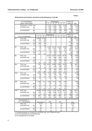 Niedersächsischer Landtag − 14. Wahlperiode Drucksache 14/3489 Anlage 1 Wiederholende nach Schulform, Geschlecht und Schuljahrgang am 13.09.1990 bis 4. Schuljahrgang Schuljahrgang Förder- (einschl. IGS und FWS) 1 2 3 4 klasse insg. Schülerinnen u. Schüler insg. 73.753 76.767 73.344 73.449 392 297.705 dar.Wiederh.insg. abs. 1.686 2.523 948 1.644 175 6.976 % 2,3 3,3 1,3 2,2 44,6 2,3 dar.weibl.Wiederh. abs. 715 1.042 376 688 70 2.891 % 2,0 2,8 1,0 1,9 38,7 2,0 Schuljahrgang Förder- 5. bis 10. Schuljahrgang 5 6 7 8 9 10 klasse insg. OS Schül. insg. 63.584 61.392 - - - - 178 125.154 dar.Wiederh.insg. abs. 912 365 99 1.376 % 1,4 0,6 55,6 1,1 dar.weibl.Wiederh. abs. 355 142 53 550 % 1,1 0,5 62,4 0,9 HS Schül. insg. 48 54 19.905 23.444 22.329 9.586 770 76.136 dar.Wiederh.insg. abs. 2 2 248 1.162 362 193 355 2.324 % 4,2 3,7 1,2 5,0 1,6 2,0 46,1 3,1 dar.weibl.Wiederh. abs. 2 - 97 454 162 91 143 949 % 9,5 0,0 1,2 4,6 1,6 2,1 42,6 2,9 RS Schül. insg. 24.341 23.581 23.434 23.178 50 94.584 dar.Wiederh.insg. abs. - - 1.153 1.638 1.602 580 0 4.973 % 4,7 6,9 6,8 2,5 5,3 dar.weibl.Wiederh. abs. 478 752 712 291 2.233 % 0,0 0,0 3,8 6,2 5,8 2,4 0,0 4,6 Gym. Schül. insg. 1.357 1.252 20.991 20.285 19.053 18.005 34 80.977 dar.Wiederh.insg. abs. 9 11 481 840 805 600 0 2.746 % 0,7 0,9 2,3 4,1 4,2 3,3 3,4 dar.weibl.Wiederh. abs. 3 6 196 364 344 291 1.204 % 0,4 0,8 1,8 3,4 3,4 3,1 2,8 KGS Schül. insg. 2.583 2.445 2.936 2.902 2.957 2.435 16.258 dar.Wiederh.insg. abs. 49 24 66 144 138 77 498 % 1,9 1,0 2,2 5,0 4,7 3,2 3,1 dar.weibl.Wiederh. abs. 21 11 29 49 63 33 206 % IGS Schül. insg. 2.296 2.112 2.030 2.102 1.959 1.803 12.302 dar.Wiederh.insg. abs. 27 11 20 8 11 81 158 % 1,2 0,5 1,0 0,4 0,6 4,5 1,3 dar.weibl.Wiederh. abs. 13 6 8 6 7 35 75 % 1,0 0,5 0,7 0,5 0,6 3,3 1,1 2) Sek I Schül. insg. 69.868 67.255 70.203 72.314 69.732 55.007 1.032 405.411 dar.Wiederh.insg. abs. 997 411 1.968 3.792 2.918 1.531 454 12.071 % 1,4 0,6 2,8 5,2 4,2 2,8 44,0 3,0 dar.weibl.Wiederh. abs. 394 165 808 1.625 1.288 741 196 5.217 % 1,1 0,5 2,4 4,6 3,7 2,6 41,4 2,6 Sekundarbereich II ( nur 11. Schuljahrgang) Gymnasium 3) KGS IGS insg. Schül. insg. 19.141 763 1.151 21.055 dar.Wiederh.insg. abs. 606 39 58 703 % 3,2 5,1 5,0 3,3 dar.weibl.Wiederh. abs. 291 17 17 325 % 2,9 4,0 2,9 2,9 1) Prozentwerte bezogen auf "Schülerinnen und Schüler insg.", bzw. "Schülerinnen insg." 2) ohne Freie Waldorfschulen und Sonderschulen 3) ohne Abendgymnasien und Kollegs 6
