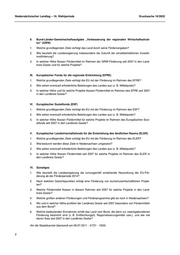 Niedersächsischer Landtag – 16. Wahlperiode Drucksache 16/3932 II. Bund-Länder-Gemeinschaftsaufgabe „Verbesserung der regionalen Wirtschaftsstruk- tur“ (GRW) 1. Welche grundlegenden Ziele verfolgt das Land durch seine Fördervergaben? 2. Wie beurteilt die Landesregierung insbesondere die Zukunft der einzelbetrieblichen Investiti- onsförderung? 3. In welcher Höhe flossen Fördermittel im Rahmen der GRW-Förderung seit 2007 in den Land- kreis Goslar und für welche Projekte? III. Europäischer Fonds für die regionale Entwicklung (EFRE) 1. Welche grundlegenden Ziele verfolgt die EU mit der Förderung im Rahmen des EFRE? 2. Wie sehen eventuell erforderliche Beteilungen des Landes aus (z. B. Mittelquote)? 3. In welcher Höhe und für welche Projekte flossen Fördermittel im Rahmen des EFRE seit 2007 in den Landkreis Goslar? IV. Europäischer Sozialfonds (ESF) 1. Welche grundlegenden Ziele verfolgt die EU mit der Förderung im Rahmen des ESF? 2. Wie sehen eventuell erforderliche Beteilungen des Landes aus (z. B. Mittelquote)? 3. In welcher Höhe flossen Fördermittel für welche Projekte im Rahmen des Europäischen Sozi- alfonds seit 2007 in den Landkreis Goslar? V. Europäischer Landwirtschaftsfonds für die Entwicklung des ländlichen Raums (ELER) 1. Welche grundlegenden Ziele verfolgt die EU mit der Förderung im Rahmen des ELER? 2. Wie/wodurch werden diese Ziele in Niedersachsen umgesetzt? 3. Wie sehen eventuell erforderliche Beteilungen des Landes aus (z. B. Mittelquote)? 4. In welcher Höhe flossen Fördermittel seit 2007 für welche Projekte im Rahmen des ELER in den Landkreis Goslar? VI. Sonstiges 1. Wie beurteilt die Landesregierung die turnusgemäß anstehende Neuordnung der EU-För- derung ab der Förderperiode 2014? 2. Nach welchen Gesichtspunkten erfolgt eine Förderung von tourismuswirtschaftlichen Projek- ten? 3. Welche Fördermittel flossen in diesem Rahmen seit 2007 für welche Projekte in den Land- kreis Goslar? 4. Welche großen anderen Förderungen und Förderprogramme gibt es noch in Niedersachsen? 5. Wo und in welcher Höhe profitiert der Landkreis Goslar seit 2007 besonders von Fördermitteln aus dem Bund? 6. Welche bedeutenden Einnahmen erhält das Land vom Bund, die dann zur zweckgebundenen Förderung bestimmt sind (z. B. EntflechtungsG, Regionalisierungsmittel usw.), und wie viel davon floss seit 2007 in den Landkreis Goslar? (An die Staatskanzlei übersandt am 06.07.2011 - II/721 - 1024) 2