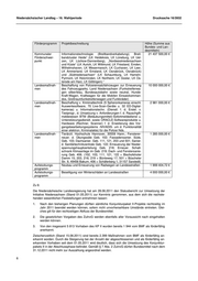 Niedersächsischer Landtag – 16. Wahlperiode Drucksache 16/3932 Förderprogramm Projektbeschreibung Höhe (Summe aus Bundes- und Lan- desmitteln) Kommunaler Informationstechnologie (Breitbandverkabelung); Breit- 21 437 500,00 € Förderschwer- bandcluster Heide“ (LK Heidekreis, LK Lüneburg, LK Uel- punkt zen, LK Lüchow-Dannenberg), „Nordwestniedersachsen und Küste“ (LK Aurich, LK Wittmund, LK Friesland, Emden, Wilhelmshaven, LK Wesermarsch, LK Cuxhaven, LK Leer, LK Ammerland, LK Emsland, LK Osnabrück, Osnabrück) und „Südniedersachsen“ (LK Schaumburg, LK Hameln- Pyrmont, LK Holzminden, LK Northeim, LK Goslar, LK Os- terode am Harz, LK Göttingen).“ Landesmaßnah- Beschaffung von Polizeieinsatzfahrzeugen zur Erneuerung 10 000 000,00 € men des Fahrzeugparks, Land Niedersachsen (Funkstreifenwa- gen silber/blau, Bundesautobahn sowie neutral, Hunde- Kraft-Wagen, Kraftwagen für die Mobilen Einsatzkomman- dos, Großraumfunkstreifenwagen und Funkkräder) Landesmaßnah- Beschaffung v. Kriminaltechnik (5 Spheronkameras einschl. 2 981 000,00 € men Auswertesoftware, 70 Live-Scan-Geräte u. 32 ED-Digital- kameras) u. Informationstechn. (Dienstl. f. d. Erstel. v. Testprogr., d. Umsetzung v. Anforderungen f. d. Rauschgift- meldewesen BTM (Betäubungsmittel)-Sofortmeldedienst u. Unterstützungsdienstl. sowie ORACLE-Softwareprodukte u. Hardware (Rechner, Scanner) f. d. Erweiterung des Vor- gangsbearbeitungssystems -NIVADIS- um d. Funktionalität einer elektron. Kriminalakte) für die Polizei Nds. Landesmaßnah- Tierärztl. Hochschule Hannover, 30559 Hann.; Fensterer- 1 285 000,00 € men neuer. d. Übungssäle Geb. 102; Fassadensanier. Süds. Geb. 103; Dachsanier. Geb. 111, 121, 203 und 501; Sanier. d. Sanitärtechnikzentrale Geb. 122; Erneuerung der Nieder- spannungshauptverteilung Geb. 218; Erneuer. Schalt- schrank Klimaanlage im Geb. 219; Dach- und Fenstersanie- rung Geb. 406. (102, 103, 111, 121, 122 = Bischofsholer Damm 15; 203, 218, 219 = Bünteweg 17; 501 = Büscheler Str. 9, 49456 Bakum; 406 = Schäferberg 1, 31157 Sarstedt) Aufstockungs- Neubau und Erneuerung von Radwegen an Landesstraßen 1 999 404,72 € programm Aufstockungs- Beseitigung von Winterschäden an Landesstraßen 4 000 000,00 € programm Zu 6: Die Niedersächsische Landesregierung hat am 28.06.2011 den Statusbericht zur Umsetzung der Initiative Niedersachsen (Stand 01.05.2011) zur Kenntnis genommen, aus dem sich die nachste- henden wesentlichen Feststellungen entnehmen lassen: 1. Nach den bisherigen Planungen dürften sämtliche Konjunkturpaket II-Projekte rechtzeitig im Jahr 2011 beendet werden können, sofern nicht unvorhersehbare Umstände eintreten. Glei- ches gilt für den rechtzeitigen Abfluss der Bundesmittel. 2. Die gesetzlichen Vorgaben des ZuInvG werden ebenfalls aller Voraussicht nach eingehalten werden können. 3. Von den insgesamt 5 813 Vorhaben des KP II wurden bereits 1 944 vom BMF als förderfähig anerkannt. Zwischenzeitlich (Stand 15.08.2011) sind bereits 2.399 Maßnahmen vom BMF als förderfähig an- erkannt worden. Durch die Steigerung bei der Anzahl der abgeschlossenen und als förderfähig an- erkannten Vorhaben seit dem 01.05.2011 wird deutlich, dass sich die Umsetzung des Konjunktur- pakets II in der Abschlussphase befindet. Gemäß § 7 Abs. 2 ZuInvG dürfen Bundesmittel nach dem 31.12.2011 nicht mehr zur Auszahlung angeordnet werden. 6