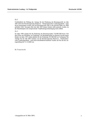 Niedersächsischer Landtag – 14. Wahlperiode Drucksache 14/2306 Zu 2: Vorbehaltlich der Prüfung des Antrags für die Förderung der Beratungsstelle im Jahr 2001 durch die Bezirksregierung Hannover - Niedersächsisches Landesjugendamt - kann davon ausgegangen werden, dass die Beratungsstelle 2001 in der gleichen Höhe wie 2000 gefördert wird. Aussagen über das Jahr 2001 hinaus können nicht gemacht werden, da der Haushaltsplan eine entsprechende Verpflichtungsermächtigung nicht enthält. Zu 3: Im Jahre 1996 standen für die Förderung der Beratungsstellen 710 000 DM bereit. Seit dem Erlass der Richtlinie zur Förderung von Beratungsstellen im Bereich Gewalt gegen Kinder im Jahre 1997 stehen jährlich für die Förderung 785 000 DM zur Verfügung. Die Anträge für das Jahr 2001 konnten von der Bezirksregierung Hannover - Niedersächsi- sches Landesjugendamt - noch nicht abschließend bearbeitet werden, da Frist für die An- tragstellung der 31.12.2000 war. Dr. Trau ern ich t (Ausgegeben am 16. März 2001) 3
