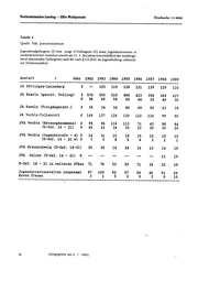 Niedersächsischer Landtag — Elfte Wahlperiode Drucksache 11/4046 Tabelle 3 Anvenöung des $ 47 JGE in erstinstanzlichen Strafverfahren In Kiedersachsen in den Jahren 1976 Dis 1988 Quelle: Zanikartenerneuung in Sıraf- ung Bußgeldsachen 1978 1979 1980 1981 1982 vert, sar.: Verf. dar,: verf, ear.: verf. dar.: Verf. dar.: insges. Einst. | insges. Einst, jinsges. Einst. | insges. Einst. | insaes. Einst. nach nech nach nach ;_o ya Er) ‚o Jh Jul J66 66 Mutsgerichte erlediate Strafver- fahren ınsgesamt 84 .83£ 2.892 81.758 3,156 89.452 4,831 95.3111 5,845 darunier erledigt ourch - Juaendrichter 24.829 2.748 25.101 3.037 29.345 4.686 31.578 5.6 « Jugenaschöffengericht 6.005 ı 5.87% 8_ 6.447 ı02 6.664 108 = Juoendgerichte insges,. 30.834 2.849 30.972 3,120 35.792 4.788 38.242 5.79 vn. 4. Jwmenogerichie 9,2% 10,1% 13,21 Ip 43 Landgerichte erledigte Strafverfan- ren erster Instanz insgesamt 1.135 ° 1,115 ö 1.165 . i 1.290 , darunter erlediat durch = Jugendkammer 197 0 246 ° 274 ı 290 i 1963 1984 1986 1987 Verf, dar.: Verf, dar.: Verf. dar.: Verf. dır.: insges, Einst. | insges. Einst. inspes. Einst. | insaes. Einst, nach nach nach DE}; 7 $4 66 J56 J66 Matsgerichte erledigte Strafver- fahren insgesamt 93.348 6.472 91.217 83.494 4.984 darunter erledigt durch - Jugengrichter 31.226 6.298 29.266 22.484 4.810 - Jugendscnöffengerient 6.073 113 6.173 110 5.347 118 - Juoencnerichte insges. 37.299 6,401 25.439 27.831 4.928 v.H. d. Juaendgerichte 17,2% 17,7% Landgerichte erledigte Strafverfah- ren ersıer Instanz insgesam 1.429 0 1.301 0 darunter erledigt durch . - Jugendksamer . 267 0 258 ö 1988 Verf. der.: insges. Einst. nach 547 J66 Antsgerichte erledigte Strafver- fahren insgesart 82.138 4.637 aarunier erledigt durcn - Jugendrichter 22.631 4.769 - Jugenoschöffengericnt 5.543 110 - Jusendgerichte insons, 28.378 «.879 v.R, 4. Jugendgerichte 17.25 Landgerichte erlediste Stretverfan- ren ersier Inszanz insgesam 1.395 & oarunier erledier aurer - Jugendkamer 303° v