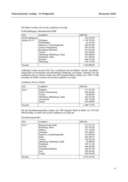 Niedersächsischer Landtag 14. Wahlperiode Drucksache 14/261 Die Mittel verteilen sich auf die Landkreise wie folgt: GI Beschäftigung, Aktionsbereich NOW Ziel Landkreis ESF (B) GI Beschäftigung 370 435,00 Schwp. GI 11 Göttingen 1 749 767,00 Wolfenbüttel 26 537,00 Hannover, Landeshauptstadt 650 952,00 Lüchow-Dannenberg 582 833,00 Rotenburg (Wümme) 914 635,00 Verden 481 848,00 Oldenburg (Oldenburg), Stadt 246 000,00 Osnabrück, Stadt 971 504,00 Emsland 890 541,00 Oldenburg 539 157,00 Gesamt 7 424 009,00 Außerdem werden aus dem Ziel 3 die „Landfrauen-Service-Stellen“ und die „Koordinie- rungsstellen zur beruflichen und betrieblichen Förderung von Frauen“ gefördert. Für die Landfrauen-Service-Stellen wurden seit 1994 folgende Mittel in Höhe von 1 300 717 DM bewilligt; die Mittel verteilen sich auf die Landkreise wie folgt: Landfrauen-Service-Stellen Ziel Landkreis ESF (B) Ziel 3 Diepholz 211 527,00 Lüchow-Dannenberg 446 404,00 Verden 50 000,00 Oldenburg (Oldenburg), Stadt 102 512,00 Ammerland 295 774,00 Aurich 194 500,00 Gesamt 1 300 717,00 Für die Koordinierungsstellen wurden seit 1994 folgende Mittel in Höhe von 3 972 428 DM bewilligt; sie teilen sich auf die Landkreise wie folgt auf: Koordinierungsstellen Ziel Landkreis ESF (B) Ziel 3 Braunschweig, Stadt 273 571,78 Wolfsburg, Stadt 387 547,00 Gifhorn 287 138,00 Göttingen 445 460,45 Hannover, Landeshauptstadt 333 092,00 Stade 305 249,75 Verden 194 561,00 Oldenburg (Odenburg), Stadt 25 000,00 Osnabrück 338 311,00 Emsland 364 464,00 Grafschaft Bentheim 228 911,00 Leer 394 561,00 Vechta 394 561,00 Gesamt 3 972 427,98 11