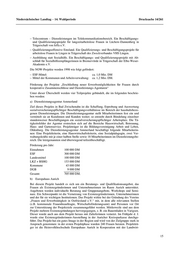 Niedersächsischer Landtag 14. Wahlperiode Drucksache 14/261 Das Land Niedersachsen hat sämtliche Fördermittel aus den Strukturfonds eingeworben, die nach den Verteilungskriterien der EU-Kommission erzielbar gewesen sind. Bis Ende 1999 werden die zur Verfügung stehenden Mittel komplett gebunden. Zu 4.5: Die Programme erfordern einen unterschiedlich hohen Verwaltungsaufwand. Durch die Vielzahl der Förderregionen ist er beim Ziel-5b-Programm am höchsten. Auftretenden Problemen bei der Antragstellung durch mangelnde Informationen über Fördervorausset- zungen, Finanzierungsmöglichkeiten etc. wird von verschiedenen Stellen begegnet. Die Bezirksregierungen, die Anträge entgegennehmen, bearbeiten und schließlich bescheiden, sind im Rahmen der Wirtschaftsförderung den Antragstellerinnen und Antragstellern behilflich. Es gibt Beratungs- und Informationsmöglichkeiten durch das Wirtschaftsmini- sterium, das zusätzlich einen „Info-Service für Existenzgründungen und Mittelstand“ eingerichtet hat. Ferner beraten die EURO-INFO-Center in Hannover und Osnabrück und für den ländlichen Raum die „Carrefour Stellen“ bei dem Unternehmen „M Con“ in Ol- denburg und bei der Bezirksregierung in Lüneburg sowie alle antragsannehmenden Stel- len die Antragsteller bei der Bewältigung der korrekten Antragstellung. In Niedersachsen hat die Landesregierung sichergestellt, daß die Antragsteller durch die Landesgesellschaft für Integration und Beschäftigung mbH (LaGIB) die erforderlichen Informationen und Beratungen erhalten. Die Landesregierung hält den bürokratischen Aufwand, der mit der Beantragung von EU-Mitteln verbunden ist und den die EU vorge- geben hat, in den meisten Fällen für zu hoch. Sie setzt sich daher im Rahmen der Ver- handlungen zur Agenda 2000 mit Nachdruck dafür ein, daß die Verwaltungsverfahren vereinfacht werden. Zu 4.6: Das in der Anfrage genannte Arbeitsförderungsgesetz ist nicht mehr in Kraft. Es wurde mit dem Arbeitsförderungsreformgesetz vom 24. 3. 1997 durch das Dritte Buch Sozialge- setzbuch (SGB III) ersetzt, das nicht nur eine formelle Neuerung bedeutet, sondern auch materiell andere Kriterien enthält. Nach Information durch das Landesarbeitsamt Nieder- sachsen-Bremen liegen Daten zur Beteiligung von Frauen im ländlichen Raum an Maß- nahmen der beruflichen Weiterbildung nach dem SGB III nicht vor. Insgesamt ist festzustellen, daß in diesem Förderbereich 1997 die Frauenbeteiligung leicht zurückgegangen ist. Ihr Anteil an allen Maßnahmeeintritten im Landesarbeitsamts- bezirk Niedersachsen-Bremen belief sich 1997 auf 40 % nach 41 % in 1996 und nach 42 % in 1995. Im Vergleich dazu betrug die Frauenquote unter den Arbeitslosen des Jahres 1997 43 %. Zu 4.7 und 4.8: Die Landesregierung verfolgt mit einer Vielzahl von Förderprogrammen das Ziel, die Verhältnisse in den ländlichen Räumen zu verbessern. Zu nennen sind hier u.a. Förder- instrumente: ¤ im Rahmen der Gemeinschaftsaufgabe „Verbesserung der regionalen Wirtschafts- struktur“ ¤ im Rahmen der Gemeinschaftsaufgabe „Verbesserung der Agrarstruktur und des Kü- stenschutzes wie beispielsweise das Agrarinvestitionsförderungsprogramm, die Flurbe- reinigung, die Dorferneuerung, der ländliche Wegebau, Umstellungshilfe ¤ im ländlichen Siedlungswesen wie beispielsweise Programme zur Förderung des Woh- nungsbaues, für Betriebserweiterung und zur Umsiedlung landwirtschaftlicher Betriebe ¤ zur Investitionsförderung im Bereich der Verarbeitung und Vermarktung, der Diversi- fizierung der Produktion und 12
