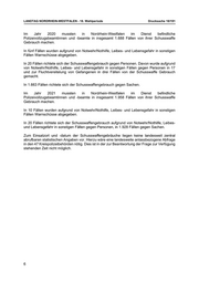LANDTAG NORDRHEIN-WESTFALEN - 18. Wahlperiode Drucksache 18/191 In der PKS NRW werden Schusswaffen als Tatmittel wie folgt erfasst: Pistole/Revolver Gewehr Gaswaffe/Schreckschusswaffe Luft- oder Federdruckwaffe sonstige Schusswaffe. Das PKS-Tatmittel wird fallbezogen erfasst und kann nicht mit einem bestimmten Tatverdächtigen verknüpft werden. Die Beantwortung der Fragen 2 und 3 berücksichtigt für das Jahr 2022 die statistischen Zahlen mit Stand vom 31.05.2022. Die PKS NRW ist eine Jahresstatistik. Die Darstellung unterjähriger Entwicklungen besitzt lediglich eine eingeschränkte Validität, da Qualitätssicherungsmaßnahmen nicht abschließend durchgeführt sind. 2. Wie viele Straftaten wurden seit 2019 in Nordrhein-Westfalen begangen, bei denen Handfeuerwaffen (tatsächliche und vermeintliche) verschiedenster Kategorien (z. B. Schreckschusswaffen, Scheinwaffen, Jagd- u. Sportwaffen etc.) als Tatmittel eingesetzt wurden? Die Anlage 1 führt die Anzahl der Fälle auf, in denen das Tatmittel Schusswaffe erfasst wurde. 3. Welche Erkenntnisse liegen im Zusammenhang mit Handfeuerwaffenattacken über Täterprofile vor und wie oft waren insbesondere Jugendliche und Heranwachsende die Täter? Die PKS NRW erfasst keine Täterprofile. Für die Erstellung von Täterprofilen bedarf es einer aufwändigen Analyse der Gesamtzahl der Fälle. Dies ist in der zur Beantwortung der kleinen Anfrage zur Verfügung stehenden Zeit nicht möglich. Die Anlage 2 stellt dar, wie viele Tatverdächtige zu Fällen gemeldet wurden, in denen das Tatmittel Schusswaffe erfasst wurde. Aufgeführt wird die Anzahl von Jugendlichen, Heranwachsenden und Tatverdächtigen insgesamt. 4. In wie vielen Fällen mussten seit 2019 in Nordrhein-Westfalen im Dienst befindliche Polizeibeamte von ihrer Dienstwaffe Gebrauch machen? (Bitte nach Einsatzgrund, -ort und -datum aufschlüsseln) Im Jahr 2019 mussten in Nordrhein-Westfalen im Dienst befindliche Polizeivollzugsbeamtinnen und -beamte in insgesamt 1.632 Fällen von ihrer Schusswaffe Gebrauch machen. In 12 Fällen wurden Warnschüsse abgegeben. In 11 Fällen wurden die Warnschüsse aufgrund von Notwehr/Nothilfe, Leibes- und Lebensgefahr in sonstigen Fällen und in einem Fall zur Fluchtvereitelung von Gefangenen abgegeben. In 14 Fällen richtete sich der Schusswaffengebrauch aufgrund von Notwehr/Nothilfe, Leibes- und Lebensgefahr in sonstigen Fällen gegen Personen, in 1.606 Fällen gegen Sachen. 5