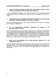 LANDTAG NORDRHEIN-WESTFALEN - 18. Wahlperiode Drucksache 18/266 2. Gibt es am derzeit vorgelegten Entwurf einer 6,50 m breiten Straße ohne Rad- /Fußweg Veränderungen oder sind diese noch vorgesehen? In den Planfeststellungsunterlagen sind keine Änderungen zum genehmigten Entwurf vorgenommen worden. Ein Radweg ist in separater Führung vorgesehen (vgl. Antwort zu Frage 3.). 3. Ist beabsichtigt, dem zuständigen Regionalrat den Wunsch nach einem Radweg entlang der L 239 zwecks Abgabe eines Votums vorzulegen? Der Geh- und Radweg entlang der L 239 ist seit 2019 Bestandteil des Programms „Radwege an bestehenden Landesstraßen“. 4. Ist, wie Presseberichte mutmaßen, vorgesehen, die Straße für den Schwerlastverkehr zu öffnen? Die L 239 ist temporär aufgrund des baulichen Zustandes, der zu gerin-gen Fahrbahnbreite und der engen Radien für den LKW-Durchgangsverkehr gesperrt. Gemäß § 3 Abs. 2 Straßen- und Wegegesetz Nordrhein-Westfalen sind Landesstraßen Straßen mit mindestens regionaler Verkehrsbedeutung, die – beschränkungsfrei – den durchgehenden Verkehrsverbindungen dienen oder zu dienen bestimmt sind. Mit der Sanierung der L 239 entfällt die bisherige Begründung zur Sperrung der Strecke aufgrund des baulichen Zustandes. 5. Wann ist mit dem Baubeginn des in Rede stehenden Teilstücks der L 239 frühestens zu rechnen? Nach Abschluss des Planfeststellungsverfahrens kann die Bauvorberei-tung der Maßnahme begonnen werden. Da der Abschluss des Planfest-stellungsverfahrens nicht benennbar ist (vgl. Antwort zu Frage 1), ist auch der Baubeginn zum jetzigen Zeitpunkt verantwortlich nicht abschätzbar. 2