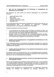 LANDTAG NORDRHEIN-WESTFALEN - 18. Wahlperiode Drucksache 18/488 1. Was sind die Leistungsmerkmale der Klimaanlage im Hauptgebäude des Ministeriums der Justiz NRW? Das Ministerium der Justiz besteht aus mehreren Gebäudeteilen aus verschiedenen Baujahren: • sogenannter Neubau (1978), • Altbau (1859), • Josephinenhaus (1877), • ehemaliges Arbeitsgericht (1859), • Tiefgarage (1978). Da die Gebäudeteile jeweils unterschiedlich ausgestattet sind, werden die durch den Bau- und Liegenschaftsbetrieb NRW - als Eigentümer der Liegenschaft - mitgeteilten Leistungsmerkmale in der anliegenden Tabellenübersicht dargestellt. Folgende Anmerkungen sind hierzu erforderlich: • In den Büroräumen des Neubaus erfolgt die Kühlung und Heizung der Büro- und Verwaltungsräume durch Konvektionsgeräte. Die Kälteerzeugung für das System erfolgt durch eine auf dem Dach stehende, luftgekühlte Kältemaschine. • Außerdem werden die Prüfungsräume des Landesjustizprüfungsamtes Nordrhein- Westfalen (LJPA) im Neubau und die IT-Serverräume im Altbau gekühlt. In beiden Fällen sind funktionsbezogen vorgegebene Raumtemperaturen einzuhalten. 2. Inwiefern wird die Raumtemperatur im Hauptgebäude des Ministeriums mit der Klimaanlage reguliert? Da die Gebäudeteile jeweils mit verschiedenen Klimaanlagen ausgestattet sind, werden die Angaben zur Regulierungsmöglichkeiten der Raumtemperaturen ebenfalls in der anliegenden Tabellenübersicht dargestellt. 3. Inwiefern hält sich das Ministerium an die empfohlene Raumtemperatur nach der Arbeitsstättenrichtlinie? Grundsätzlich werden die Raumtemperaturen nach der Arbeitsstättenrichtlinie eingehalten. Bei einer Über- oder Unterschreitung der vorgegebenen Temperaturen werden entsprechende Maßnahmen nach der Arbeitsstättenrichtlinie eingeleitet. 4. Welche Energieeinsparung wurde bzw. wird durch eine Neuregulierung der Raum- Soll-Temperatur erreicht? Wie hoch eine Energieeinsparung tatsächlich konkret ausfällt, lässt sich nur durch Installation von Energiemesszählern bestimmen. Energiemesszähler sind jedoch im Ministerium der Justiz nicht vorhanden. Energieeinsparungen durch veränderte Einstellungsparameter an den vorhandenen Klimaanlagen lassen sich daher nicht beziffern. Generell ist eine Abschätzung von Energieverbräuchen von Kälteanlagen insbesondere abhängig vom Gerätetyp, der Betriebszeit, der benötigten Kühlleistung, den 2