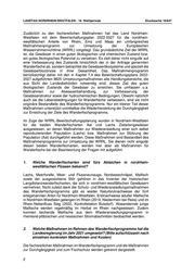 LANDTAG NORDRHEIN-WESTFALEN - 18. Wahlperiode Drucksache 18/647 Zusätzlich zu den fischereilichen Maßnahmen hat das Land Nordrhein- Westfalen mit dem Bewirtschaftungsplan 2022-2027 für die nordrhein- westfälischen Anteile von Rhein, Ems und Maas ein umfangreiches Maßnahmenprogramm zur Umsetzung der Europäischen Wasserrahmenrichtlinie (WRRL) vorgelegt. Das grundsätzliche Ziel der WRRL ist, die Gewässer in einen guten ökologischen und chemischen Zustand bzw. ein gutes ökologisches Potenzial zu versetzen. Es zielt daher nicht singulär auf eine Verbesserung des Zustands hinsichtlich der in der Anfrage genannten Wanderfische ab, sondern betrachtet die Gewässerökosysteme und speziell die Gewässerbiozönose in ihrer Gesamtheit. Das Maßnahmenprogramm berücksichtigt daher mit den in Kapitel 7.4 des Bewirtschaftungsplans 2022- 2027 aufgeführten 9825 Umsetzungsmaßnahmen alle Handlungsbereiche, die aus Sicht der Landesbehörden notwendig sind, dieses Ziel des guten ökologischen Zustands der Gewässer zu erreichen. Sie umfassen u.a. Maßnahmen zur Abwasserbehandlung, zur Verbesserung der Gewässerstruktur sowie der hydrochemischen Bedingungen. Obwohl natürlich auch sie die Lebensbedingungen für Wanderfische verbessern, sind sie nicht originäre Bestandteile des Wanderfischprogramms. Nur ein kleiner Teil dieser Maßnahmen unterstützt unmittelbar die Wiederherstellung der Durchgängigkeit zur Erreichung der Ziele des Wanderfischprogramms. Im Zuge der WRRL-Bewirtschaftungsplanung wurden in Nordrhein-Westfalen für die beiden Wanderfischarten Aal und Lachs Zielartengewässer ausgewiesen, an denen Maßnahmen zur Wiederansiedlung einer sich selbst reproduzierenden Population (Lachs) bzw. Maßnahmen zur Stützung der Population (Aal) durchgeführt werden. Diese Maßnahmen sind Bestandteil des Maßnahmenprogramms zur Umsetzung der WRRL. Sie dienen nicht singulär diesen beiden Wanderfischarten, werden hier aber als Maßnahmen für Wanderfische bei der Beantwortung der Fragen mit aufgeführt. 1. Welche Wanderfischarten sind fürs Ablaichen in nordrhein- westfälischen Flüssen bekannt? Lachs, Meerforelle, Meer- und Flussneunauge, Nordseeschnäpel, Maifisch sowie der ausgestorbene Stör gehören in das Inventar der historischen Langdistanzwanderfischarten, die sich in nordrhein-westfälischen Gewässern vermehren. Nicht zuletzt dank der Schutz- und Wiederansiedlungsmaßnahmen des Wanderfischprogramms gibt es wieder Naturbrutnachweise der fünf erstgenannten Arten für Nordrhein-Westfalen. Erstnachweise adulter Maifische in Nordrhein-Westfalen gelangen im Rhein (2014, Niederrhein bei Rees) und im Rhein-Nebenfluss Sieg (2022, Kontrollstation Buisdorf). Abwandernde junge Maifische werden regelmäßig im Herbst im Rhein nachgewiesen. Zudem konnten laichende Maifische aus dem Wiederansiedlungsprogramm in rheinland-pfälzischen und hessischen Stromabschnitten beobachtet werden. 2. Welche Maßnahmen im Rahmen des Wanderfischprogramms hat die Landesregierung im Jahr 2021 umgesetzt? (Bitte aufschlüsseln nach einzelnen konkreten Maßnahmen und Kosten) Die fischereilichen Maßnahmen im Wanderfischprogramm und die Maßnahmen zur Durchgängigkeit und zum Fischschutz werden getrennt dargestellt. 2