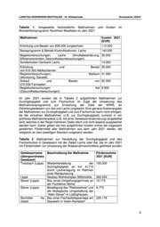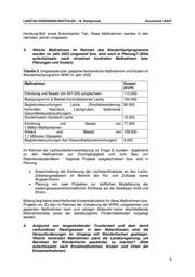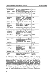 LANDTAG NORDRHEIN-WESTFALEN - 18. Wahlperiode Drucksache 18/647 Tabelle 1: Umgesetzte fischereiliche Maßnahmen und Kosten im Wanderfischprogramm Nordrhein-Westfalen im Jahr 2021 Maßnahmen Kosten 2021 [EUR] Erbrütung und Besatz von 826.000 Junglachsen 112.000 Basisprogramm & Betrieb Kontrollstationen, Lachs 140.000 Begleituntersuchungen, Lachs (Smoltabwanderung, 30.000 Effizienzkontrollen, Gesundheitsuntersuchungen) Sonderkosten Genbank Lachs 14.000 Erbrütung und Besatz 56.000 von 610 000 Maifischlarven Begleituntersuchungen, Maifisch 41.000 (Monitoring, Genetik) Ankauf und Besatz von 82.000 270.000 Farmaalen Begleituntersuchungen Aal 9.000 (Gesundheitsuntersuchungen) Im Jahr 2021 wurden die in Tabelle 2 aufgeführten Maßnahmen zur Durchgängigkeit und zum Fischschutz im Zuge der Umsetzung des Maßnahmenprogramms zur Erreichung der Ziele der WRRL an Zielartengewässern von Aal und Lachs umgesetzt. Eine genaue Kostenangabe der Maßnahmen zur Durchgängigkeit und zum Fischschutz kann nicht erfolgen, da die einzelnen Maßnahmen (z.B. zur Durchgängigkeit) zumeist in ein größeres Maßnahmenpaket (z.B. mit einer Gewässerrenaturierung) eingebettet sind, welches in der Regel mehreren Zielen dient und nicht separat ausgewertet werden kann. Daher geben die hier aufgeführten Kosten immer die insgesamt gewährten Fördermittel aller Maßnahmen aus dem Jahr 2021 wieder, die zeitgleich an dem jeweiligen Standort umgesetzt werden. Tabelle 2: Maßnahmen zur Herstellung der Durchgängigkeit und des Fischschutzes in Gewässern mit der Zielart Lachs oder Aal, die im Jahr 2021 mit Fördermitteln zur Umsetzung der Wasserrahmenrichtlinie gefördert wurden Gewässername Beschreibung der Maßnahme Fördersumme (übergeordnetes 2021 [EUR] Gewässer) Trotzbach (Lippe) Wiederherstellung der 150.000 Durchgängigkeit an km 4+710 durch Laufverlegung im Rahmen einer Renaturierung Lippe Neubau Wehrkomplex Stiftsmühle 363.024 Stever (Lippe) Bau eines Umgehungsgerinnes an 10.715 der Füchtelner Mühle Stever (Lippe) Beseitigung des "Rialtowehres" und 8.773 die ökologische Umgestaltung der "Alten Stever" in Lüdinghausen Bocholter Aa Bau einer Fischaufstiegsanlage am 220.178 (Issel) Stauwehr in Velen-Ramsdorf 3