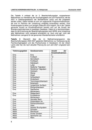 LANDTAG NORDRHEIN-WESTFALEN - 18. Wahlperiode Drucksache 18/647 Die Tabelle 4 umfasst die im 3. Bewirtschaftungsplan vorgesehenen Maßnahmen zur Herstellung der Durchgängigkeit und zum Fischschutz, die bis 2027 in Zielartengewässern der Wanderfische Lachs und Aal umgesetzt werden sollen. Dabei handelt es sich um sogenannte Programmmaßnahmen, die erst im Rahmen der Umsetzung endgültig konkretisiert werden. Eine Kostenangabe ist daher zum jetzigen Zeitpunkt nicht möglich. Die in der Tabelle genannte Anzahl an Einzelmaßnahmen bezieht sich auf die Anzahl der Wanderungshindernisse im jeweiligen Gewässer. Dabei ist zu berücksichtigen, dass für die Erreichung der Bewirtschaftungsziele nach WRRL eine Umsetzung aller Maßnahmen nicht zwingend erforderlich ist. Auch sind ggf. nicht alle Maßnahmen zwingend für die genannten Wanderfischarten erforderlich. Tabelle 4: Übersicht über die im Maßnahmenprogramm des Bewirtschaftungsplan 2022-2027 geplanten Maßnahmen zur Verbesserung der Fischdurchgängigkeit und des Fischschutzes in Gewässern mit der Zielart Lachs oder Aal, die nach aktueller Planung bis zum Jahr 2027 umgesetzt sein sollen. Teileinzugsgebiet Gewässername Anzahl der Einzelmaßnahmen Ems Ems 6 Ems Furlbach 12 Ems Sennebach 4 Ems Forthbach 1 Ems Dalkebach 3 Ems Lutter 2 Ems Südlicher Talgraben 3 Ems Nördlicher Talgraben 2 Ems Holzbach 1 Ems Werse 10 Ems Angel 13 Ems Schlautbach 3 Ems Kinderbach 3 Ems Temmingsmühlenbach 3 Ems Bullerbach 2 Ems Lengericher Aa Bach 10 Ems Eltingmühlenbach 1 Ems Saerbecker 3 Mühlenbach Ems Walgenbach 2 Ems Emsdettener 1 Mühlenbach Ems Hemelter Bach 1 Ems Düsterdieker Aa 1 Ems Ruthemühlenbach 2 Ems Hase 2 Ems Seester Bruchgraben 1 Maas Schwalm 4 Maas Nierskanal 1 Maas Ponter Dondert 1 Maas Spanische Ley 1 Maas Niers 2 6