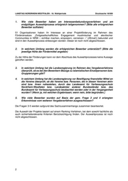 LANDTAG NORDRHEIN-WESTFALEN - 18. Wahlperiode Drucksache 18/509 1. Wie viele Bewerber haben am Interessenbekundungsverfahren und am endgültigen Auswahlprozess erfolgreich teilgenommen? (Bitte alle erfolgreichen Bewerber auflisten) 51 Organisationen haben ihr Interesse an einer Projektförderung im Rahmen des Förderansatzes „Zivilgesellschaftliches Engagement muslimischer und alevitischer Communities in NRW – sichtbar machen, empowern, vernetzen –“ (ZEmaC) bekundet und sind in den Auswahlprozess einbezogen worden. Dieser ist noch nicht abgeschlossen. 2. In welchem Umfang werden die erfolgreichen Bewerber unterstützt? (Bitte die jeweilige Höhe der Fördermittel angeben) Zu der Höhe der Förderungen kann vor dem Abschluss des Auswahlprozesses keine Aussage getroffen werden. 3. In welchem Umfang hat die Landesregierung im Rahmen des Vergabeverfahrens überprüft, ob es bei den Bewerbern Bezüge zu islamistischen Einzelpersonen bzw. Gruppierungen gibt? 4. In welchem Umfang hat die Landesregierung vor Bewilligung finanzieller Mittel an die Vereine überprüft, ob die Vereine bzw. Personen, die in diesen Vereinen aktiv sind bzw. ihnen nahestehen, durch das Landesamt für Verfassungsschutz Nordrhein-Westfalen bzw. Landesämter anderer Bundesländer bzw. das Bundesamt für Verfassungsschutz beobachtet werden oder in der Vergangenheit wurden? (Wenn ja, mit welchen Ergebnissen; wenn nein, bitte begründen.) 5. Wie viele Bewerber wurden auf Basis der gem. Frage 3 und 4 erlangten Erkenntnisse vom weiteren Vergabeverfahren ausgeschlossen? Die Fragen 3-5 werden aufgrund des Sachzusammenhangs zusammen beantwortet. Die Auswahl der Projekte basiert auf einem Ranking-Verfahren, bei dem sowohl fachliche als auch sicherheitsrelevante Kriterien Berücksichtigung finden. Der Auswahlprozess ist noch nicht abgeschlossen. 2