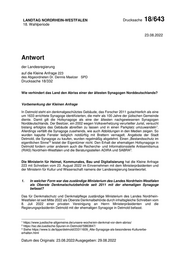 LANDTAG NORDRHEIN-WESTFALEN - 18. Wahlperiode Drucksache 18/643 2. Sieht das Land die ehemalige Synagoge derzeit als ausreichend vor dem Zerfall geschützt an? 3. Welche Einwirkungsmöglichkeiten wird das Land nutzen, um die ehemalige Synagoge vor dem Zerfall zu bewahren? 4. Mit welcher Begründung wurden beantragte Fördermittel für das Gebäude abgelehnt? 5. Was wird die Landesregierung unternehmen, um die ehemalige Hofsynagoge als Kulturerbe für die Öffentlichkeit (z.B. als Museum für jüdische Geschichte) zu erhalten? Die Fragen 2 bis 5 werden aufgrund des Sachzusammenhangs gemeinsam beantwortet. Seit der am 15. November 1988 erfolgten Eintragung in die Denkmalliste der Stadt Detmold unterliegt das anfragegegenständliche Baudenkmal umfänglich den Schutzbestimmungen des DSchG NRW. Entsprechend ist den Anweisungen der Unteren Denkmalbehörde der Stadt Detmold, die auf der Grundlage des DSchG NRW getroffen werden, Folge zu leisten. Sowohl das außer Kraft getretene Gesetz zum Schutz und zur Pflege der Denkmäler im Land Nordrhein-Westfalen als auch das neu in Kraft getretene Nordrhein-westfälische Denkmalschutzgesetz (Denkmalschutzgesetz – DSchG NRW) legt fest, dass für den Vollzug des Gesetzes die Unteren Denkmalbehörden zuständig sind. Zuständige Untere Denkmalbehörde ist die jeweilige Kommune, hier die Stadt Detmold. In Anbetracht der vorstehend beschriebenen Ausgangslage war die Oberste Denkmalbehörde im vorliegenden Fall bis Mitte 2022 nicht verfahrensbeteiligt. Alle drei bisherigen Anträge der privaten Eigentümerfamilie auf Landesdenkmalfördermittel für das Gebäude der ehemaligen Synagoge in den Jahren 2012, 2013 und 2016 konnten wegen der geringen Finanzmittel-Ausstattung für die Denkmalpflege durch die damalige Landesregierung Nordrhein-Westfalen nicht berücksichtigt werden. Seit der deutlichen Aufstockung der Denkmalfördermittel ab 2017 unter Beteiligung der heutigen Landesregierung wurde für das Gebäude kein Antrag mehr gestellt. Die ehemalige Synagoge ist unzweifelhaft sanierungsbedürftig: Es bedarf umfangreicherer Maßnahmen, um den weiteren Verfall zu stoppen und das Baudenkmal langfristig zu erhalten. Laut zuständiger Fachbehörde ist aufgrund durchgeführter Notsicherungsarbeiten der Bestand des Gebäudes aktuell nicht unmittelbar gefährdet. Nach Auskunft der Unteren Denkmalbehörde sei dem Eigentümer wiederholt der Ankauf seines Gebäudes durch die Stadt Detmold angeboten worden, bislang allerdings ohne Erfolg. Die Landesregierung Nordrhein-Westfalen unterstützt Bemühungen und Initiativen zur Sanierung der ehemaligen Detmolder Hofsynagoge und ihrer öffentlichen Zugänglichmachung als Gedenkstätte des jüdischen Lebens in Detmold. 2