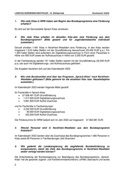 LANDTAG NORDRHEIN-WESTFALEN - 18. Wahlperiode Drucksache 18/633 1. Wie viele Kitas in NRW haben seit Beginn des Bundesprogramms eine Förderung erhalten? Es wird auf die Servicestelle Sprach-Kitas verwiesen. 2. Wie viele Kitas erhalten im aktuellen Kita-Jahr eine Förderung aus dem Bundesprogramm? (Bitte gesamt und für Jugendamtsbezirke individuell ausweisen.) Derzeit erhalten 1.491 Kitas in Nordrhein-Westfalen eine Förderung. In den Kitas werden insgesamt 1.518 halbe Stellen mit der Grundförderung bezuschusst (25.000 EUR p.a.). Für 1.464 halbe Stellen wird außerdem ein Digitalisierungszuschuss in Form einer Pauschale in Höhe von 900 EUR sowie ein Aufholzuschuss in Höhe von 3.200 EUR gezahlt. In der Fachberatung werden 101 halbe Stellen sowohl mit der Grundförderung (32.000 EUR p.a.) als auch mit Digitalisierungs- und Aufholzuschuss gefördert. Die Angaben beziehen sich auf das Kalenderjahr 2022. 3. Wie viele Bundesmittel sind über das Programm „Sprach-Kitas“ nach Nordrhein- Westfalen geflossen? (Bitte getrennt für die einzelnen Kita- bzw. Haushaltsjahre ausweisen.) Im Kalenderjahr 2022 werden folgende Mittel gezahlt: für Fachkräfte in Sprach-Kitas • 37.938.481 EUR Grundförderung • 1.317.600 EUR Digitalisierungszuschuss • 4.681.800 EUR Aufhol-Zuschuss und für Fachkräfte in Fachberatungen • 3.232.000 EUR Grundförderung • 90.900 EUR Digitalisierungszuschuss • 323.200 EUR Aufhol-Zuschuss. Die Fördersumme für NRW beläuft sich im Jahr 2022 auf insgesamt 47.583.981 EUR. 4. Wieviel Personal wird in Nordrhein-Westfalen aus dem Bundesprogramm finanziert? Im Kalenderjahr 2022 werden über die Zuschüsse des Bundesprogrammes 1.480 Personen in Kitas sowie 85 Personen in Fachberatungen (teil-)finanziert. 5. Wie gedenkt die Landesregierung die wegfallende Bundesförderung zu kompensieren, damit die Ziele des Bundesprogramms in Nordrhein-Westfalen weiter verfolgt werden können? Die Entscheidung der Bundesregierung zur Beendigung des Bundesprogramms „Sprach- Kitas“ hat die gesamte Jugend- und Familienministerkonferenz (JFMK) überrascht und wurde 2