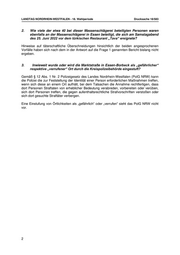 LANDTAG NORDRHEIN-WESTFALEN - 18. Wahlperiode Drucksache 18/583 2. Wie viele der etwa 40 bei dieser Massenschlägerei beteiligten Personen waren ebenfalls an der Massenschlägerei in Essen beteiligt, die sich am Samstagabend des 25. Juni 2022 vor dem türkischen Restaurant „Tava“ ereignete? Hinweise auf täterschaftliche Überschneidungen hinsichtlich der beiden angesprochenen Vorfälle haben sich nach dem in der Antwort auf die Frage 1 genannten Bericht bislang nicht ergeben. 3. Inwieweit wurde oder wird die Marktstraße in Essen-Borbeck als „gefährlicher“ respektive „verrufener“ Ort durch die Kreispolizeibehörde eingestuft? Gemäß § 12 Abs. 1 Nr. 2 Polizeigesetz des Landes Nordrhein-Westfalen (PolG NRW) kann die Polizei die zur Feststellung der Identität einer Person erforderlichen Maßnahmen treffen, wenn sich diese an einem Ort aufhält, bei dem Tatsachen die Annahme rechtfertigen, dass dort Personen Straftaten von erheblicher Bedeutung verabreden, vorbereiten oder verüben, sich dort Personen treffen, die gegen aufenthaltsrechtliche Strafvorschriften verstoßen oder sich dort gesuchte Straftäter verbergen. Eine Einstufung von Örtlichkeiten als „gefährlich“ oder „verrufen“ sieht das PolG NRW nicht vor. 2