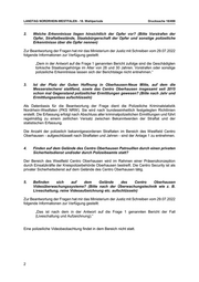 LANDTAG NORDRHEIN-WESTFALEN - 18. Wahlperiode Drucksache 18/498 2. Welche Erkenntnisse liegen hinsichtlich der Opfer vor? (Bitte Vorstrafen der Opfer, Straftatbestände, Staatsbürgerschaft der Opfer und sonstige polizeiliche Erkenntnisse über die Opfer nennen) Zur Beantwortung der Fragen hat mir das Ministerium der Justiz mit Schreiben vom 29.07.2022 folgende Informationen zur Verfügung gestellt: „Dem in der Antwort auf die Frage 1 genannten Bericht zufolge sind die Geschädigten türkische Staatsangehörige im Alter von 28 und 30 Jahren. Vorstrafen oder sonstige polizeiliche Erkenntnisse lassen sich der Berichtslage nicht entnehmen.“ 3. Ist der Platz der Guten Hoffnung in Oberhausen-Neue Mitte, auf dem die Messerstecherei stattfand, sowie das Centro Oberhausen insgesamt seit 2015 schon mal Gegenstand polizeilicher Ermittlungen gewesen? (Bitte nach Jahr und Ermittlungsanlass aufschlüsseln) Als Datenbasis für die Beantwortung der Frage dient die Polizeiliche Kriminalstatistik Nordrhein-Westfalen (PKS NRW). Sie wird nach bundeseinheitlich festgelegten Richtlinien erstellt. Die Erfassung erfolgt nach Abschluss aller kriminalpolizeilichen Ermittlungen und führt regelmäßig zu einem zeitlichen Versatz zwischen Bekanntwerden der Straftat und der statistischen Erfassung. Die Anzahl der polizeilich bekanntgewordenen Straftaten im Bereich des Westfield Centro Oberhausen - aufgeschlüsselt nach Straftaten und Jahren - sind der Anlage 1 zu entnehmen. 4. Finden auf dem Gelände des Centro Oberhausen Patrouillen durch einen privaten Sicherheitsdienst und/oder durch Polizeibeamte statt? Der Bereich des Westfield Centro Oberhausen wird im Rahmen einer Präsenzkonzeption durch Einsatzkräfte der Kreispolizeibehörde Oberhausen bestreift. Die Centro Security ist als privater Sicherheitsdienst auf dem Gelände des Centro Oberhausen tätig. 5. Befinden sich auf dem Gelände des Centro Oberhausen Videoüberwachungssysteme? (Bitte nach der Überwachungstechnik wie z. B. Liveschaltung, reine Videoaufzeichnung etc. aufschlüsseln) Zur Beantwortung der Fragen hat mir das Ministerium der Justiz mit Schreiben vom 29.07.2022 folgende Informationen zur Verfügung gestellt: „Das ist nach dem in der Antwort auf die Frage 1 genannten Bericht der Fall (Liveschaltung und Aufzeichnung).“ Eine polizeiliche Videobeobachtung findet in dem Bereich nicht statt. 2