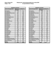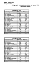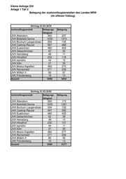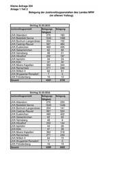 Kleine Anfrage 204 Anlage 1 Teil 2 Belegung der Justizvollzugsanstalten des Landes NRW (im offenen Vollzug) Stichtag 31.03.2015 Justizvollzugsanstalt Belegungs- Belegung fähigkeit JVA Attendorn 270 183 JVA Bielefeld-Senne 1645 1486 JVA Bochum-Langendreer 204 152 JVA Castrop-Rauxel 567 484 JVA Euskirchen 460 426 JVA Gelsenkirchen 62 60 JVA Heinsberg 48 21 JVA Hövelhof 232 187 JVA Iserlohn 44 24 JVA Köln 37 40 JVA Moers-Kapellen 362 344 JVA Remscheid 271 246 JVA Willich II 62 61 JVA Wuppertal-Ronsdorf 7 0 JVK Fröndenberg 16 12 Gesamt 4287 3726 Stichtag 31.03.2016 Justizvollzugsanstalt Belegungs- Belegung fähigkeit JVA Attendorn 270 220 JVA Bielefeld-Senne 1645 1446 JVA Bochum-Langendreer 204 141 JVA Castrop-Rauxel 567 524 JVA Euskirchen 460 422 JVA Gelsenkirchen 62 60 JVA Heinsberg 48 6 JVA Hövelhof 232 144 JVA Iserlohn 44 26 JVA Köln 37 39 JVA Moers-Kapellen 362 318 JVA Remscheid 271 249 JVA Willich II 64 72 JVA Wuppertal-Ronsdorf 7 0 JVK Fröndenberg 16 15 Gesamt 4289 3682