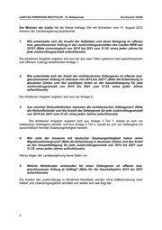 LANDTAG NORDRHEIN-WESTFALEN - 18. Wahlperiode Drucksache 18/546 Der Minister der Justiz hat die Kleine Anfrage 204 mit Schreiben vom 17. August 2022 namens der Landesregierung beantwortet. 1. Wie entwickelte sich die Anzahl der Haftplätze und deren Belegung im offenen bzw. geschlossenen Vollzug in den Justizvollzugsanstalten des Landes NRW seit 2015? (Bitte chronologisch von 2015 bis 2021 zum 31.03. eines jeden Jahres für jede Justizvollzugsanstalt aufschlüsseln) Die erbetenen Angaben ergeben sich aus der aus zwei Teilen (getrennt nach geschlossenem und offenem Vollzug) bestehenden Anlage 1. 2. Wie entwickelte sich der Anteil der nichtdeutschen Gefangenen im offenen bzw. geschlossenen Vollzug im Zeitraum von 2015 bis 2021? (Bitte die Entwicklung in absoluten Zahlen und den jeweiligen Anteil an der Gesamtbelegung für jede Justizvollzugsanstalt von 2015 bis 2021 zum 31.03. eines jeden Jahres aufschlüsseln) Die erbetenen Angaben ergeben sich aus der Anlage 2. 3. Aus welchen Herkunftsländern stammen die nichtdeutschen Gefangenen? (Bitte die Herkunftsländer und die Anzahl der Gefangenen für jede Justizvollzugsanstalt von 2015 bis 2021 zum 31.03. eines jeden Jahres aufschlüsseln) Die erbetenen Angaben ergeben sich aus Anlage 3 Teil 1, soweit es sich um staatenlose Gefangene handelt, und aus Anlage 3 Teil 2, soweit es sich um Gefangene mit ausschließlich fremder Staatsangehörigkeit handelt. 4. Wie viele der Insassen mit deutscher Staatsangehörigkeit haben einen Migrationshintergrund? (Bitte die Entwicklung in absoluten Zahlen und den Anteil an der Gesamtbelegung für jede Justizvollzugsanstalt von 2015 bis 2021 zum 31.03. eines jeden Jahres aufschlüsseln) Hierzu liegen der Landesregierung keine Daten vor. 5. Welche Nettokosten entstanden für einen Gefangenen im offenen bzw. geschlossenen Vollzug je Hafttag? (Bitte für die Haushaltsjahre 2015 bis 2021 aufschlüsseln) Die Kosten des Justizvollzugs in Nordrhein-Westfalen werden ohne Differenzierung nach Haftart und Unterbringungsform ermittelt und stellen sich wie folgt dar: 2