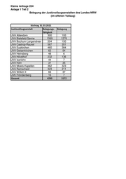 Kleine Anfrage 204 Anlage 1 Teil 2 Belegung der Justizvollzugsanstalten des Landes NRW (im offenen Vollzug) Stichtag 31.03.2021 Justizvollzugsanstalt Belegungs- Belegung fähigkeit JVA Attendorn 300 193 JVA Bielefeld-Senne 1569 1278 JVA Bochum-Langendreer 204 150 JVA Castrop-Rauxel 567 351 JVA Euskirchen 460 384 JVA Gelsenkirchen 62 54 JVA Heinsberg 48 6 JVA Hövelhof 232 136 JVA Iserlohn 44 7 JVA Köln 37 35 JVA Moers-Kapellen 362 323 JVA Remscheid 323 211 JVA Willich II 66 37 JVK Fröndenberg 16 7 Gesamt 4290 3172