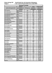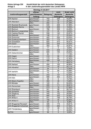 Kleine Anfrage 204 Anzahl/Anteil der nicht deutschen Gefangenen Anlage 2 in den Justizvollzugsanstalten des Landes NRW Stichtag 31.03.2015 offener/ nicht Anteil nicht Justizvollzugsanstalt geschlossener Belegung deutsche deutsche Vollzug Gefangene Gefangene JVA Aachen geschlossen 687 283 41,19% geschlossen 114 38 33,33% JVA Attendorn offen 183 45 24,59% JVA Bielefeld-Brackwede geschlossen 496 148 29,84% JVA Bielefeld-Senne offen 1486 249 16,76% JVA Bochum geschlossen 667 244 36,58% JVA Bochum-Langendreer offen 152 29 19,08% JVA Castrop-Rauxel offen 484 114 23,55% JVA Detmold geschlossen 163 34 20,86% JVA Dortmund geschlossen 418 190 45,45% JVA Duisburg-Hamborn geschlossen 315 152 48,25% JVA Düsseldorf geschlossen 810 416 51,36% JVA Essen geschlossen 537 192 35,75% offen 410 90 21,95% JVA Euskirchen geschlossen 16 0 0,00% JVA Geldern geschlossen 606 188 31,02% geschlossen 511 92 18,00% JVA Gelsenkirchen offen 60 8 13,33% JVA Hagen geschlossen 279 54 19,35% JVA Hamm geschlossen 171 69 40,35% geschlossen 399 133 33,33% JVA Heinsberg offen 21 4 19,05% JVA Herford geschlossen 267 81 30,34% offen 187 29 15,51% JVA Hövelhof geschlossen 26 4 15,38% geschlossen 191 64 33,51% JVA Iserlohn offen 24 11 45,83% JVA Kleve geschlossen 220 123 55,91% geschlossen 1081 505 46,72% JVA Köln offen 40 5 12,50% JVA Moers-Kapellen offen 344 59 17,15% JVA Münster geschlossen 569 199 34,97% geschlossen 521 135 25,91% JVA Remscheid offen 246 70 28,46% JVA Rheinbach geschlossen 310 86 27,74% JVA Schwerte geschlossen 324 25 7,72% JVA Siegburg geschlossen 434 82 18,89% JVA Werl geschlossen 801 229 28,59% JVA Willich I geschlossen 434 145 33,41% geschlossen 211 44 20,85% JVA Willich II offen 61 7 11,48% JVA Wuppertal-Ronsdorf geschlossen 422 129 30,57% JVA Wuppertal-Vohwinkel geschlossen 378 172 45,50% geschlossen 169 49 28,99% JVK Fröndenberg offen 12 3 25,00% SoThA geschlossen 55 1 1,82%