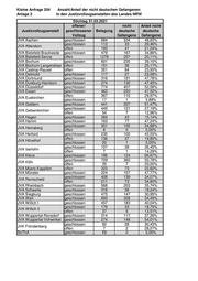 Kleine Anfrage 204 Anzahl/Anteil der nicht deutschen Gefangenen Anlage 2 in den Justizvollzugsanstalten des Landes NRW Stichtag 31.03.2021 offener/ nicht Anteil nicht Justizvollzugsanstalt geschlossener Belegung deutsche deutsche Vollzug Gefangene Gefangene JVA Aachen geschlossen 684 334 48,83% geschlossen 112 33 29,46% JVA Attendorn offen 193 41 21,24% JVA Bielefeld-Brackwede geschlossen 479 167 34,86% JVA Bielefeld-Senne offen 1278 257 20,11% JVA Bochum geschlossen 601 235 39,10% JVA Bochum-Langendreer offen 151 38 25,17% JVA Castrop-Rauxel offen 351 84 23,93% JVA Detmold geschlossen 117 27 23,08% JVA Dortmund geschlossen 316 151 47,78% JVA Duisburg-Hamborn geschlossen 274 130 47,45% JVA Düsseldorf geschlossen 774 407 52,58% JVA Essen geschlossen 463 220 47,52% offen 367 110 29,97% JVA Euskirchen geschlossen 17 1 5,88% JVA Geldern geschlossen 441 227 51,47% geschlossen 445 121 27,19% JVA Gelsenkirchen offen 54 7 12,96% JVA Hagen geschlossen 284 43 15,14% JVA Hamm geschlossen 163 77 47,24% geschlossen 301 105 34,88% JVA Heinsberg offen 6 0 0,00% JVA Herford geschlossen 235 100 42,55% offen 136 27 19,85% JVA Hövelhof geschlossen 20 1 5,00% geschlossen 107 39 36,45% JVA Iserlohn offen 7 1 14,29% JVA Kleve geschlossen 186 124 66,67% geschlossen 709 360 50,78% JVA Köln offen 35 7 20,00% JVA Moers-Kapellen offen 323 73 22,60% JVA Münster geschlossen 224 107 47,77% geschlossen 408 139 34,07% JVA Remscheid offen 211 73 34,60% JVA Rheinbach geschlossen 568 203 35,74% JVA Schwerte geschlossen 318 58 18,24% JVA Siegburg geschlossen 475 147 30,95% JVA Werl geschlossen 893 308 34,49% JVA Willich I geschlossen 457 183 40,04% geschlossen 176 33 18,75% JVA Willich II offen 37 5 13,51% JVA Wuppertal-Ronsdorf geschlossen 314 117 37,26% JVA Wuppertal-Vohwinkel geschlossen 274 148 54,01% geschlossen 92 28 30,43% JVK Fröndenberg offen 7 2 28,57% SoThA geschlossen 59 0 0,00%