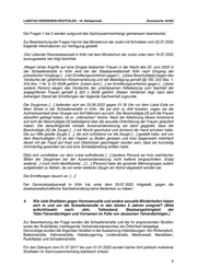 LANDTAG NORDRHEIN-WESTFALEN - 18. Wahlperiode Drucksache 18/494 Die Fragen 1 bis 3 werden aufgrund des Sachzusammenhangs gemeinsam beantwortet. Zur Beantwortung der Fragen hat mir das Ministerium der Justiz mit Schreiben vom 22.07.2022 folgende Informationen zur Verfügung gestellt: „Der Leitende Oberstaatsanwalt in Köln hat dem Ministerium der Justiz unter dem 19.07.2022 auszugsweise wie folgt berichtet: ‚Wegen eines Angriffs auf eine Gruppe lesbischer Frauen in der Nacht des 25. Juni 2022 in der Schaafenstraße in Köln wird bei der Staatsanwaltschaft Köln nach Eingang der polizeilichen Vorgänge […] ein Ermittlungsverfahren gegen […] [zwei Beschuldigte] wegen des Verdachts der gefährlichen Körperverletzung und der Beleidigung gemäß §§ 185, 223 Abs. 1, 224 Abs. 1 Nr. 4, 53 StGB geführt. Zudem wird […] ein Ermittlungsverfahren gegen […] [eine weitere Person] wegen des Verdachts der unterlassenen Hilfeleistung zum Nachteil der angegriffenen Frauen gemäß § 323 c StGB geführt. Diesen Verfahren liegt nach dem bisherigen Stand der Ermittlungen der folgende Sachverhalt zugrunde. Die Zeuginnen […] befanden sich am 25.06.2022 gegen 01.30 Uhr vor dem Lokal Exile on Main Street in der Schaafenstraße in Köln. Als sie sich zu dritt küssten, zogen sie die Aufmerksamkeit einer Gruppe von fünf Männern auf sich. Der Beschuldigte [X] soll die Frauen daraufhin gefragt haben, ob er ,,mitmachen‘‘ könne. Nach der Ablehnung dieses Ansinnens soll sich der Beschuldigte [X] beleidigend über die sexuelle Orientierung der Frauen geäußert haben. Die darauffolgende verbale Auseinandersetzung sei darin gegipfelt, dass der Beschuldigte [X] die Zeugin […] mit Wucht geschubst und drohend die Hand erhoben habe. Die zur Hilfe geeilte Zeugin […], die sich schützend vor die Zeugin […] gestellt habe, soll von dem Beschuldigten [Y] an den Haaren zu Boden gerissen und trotz Gegenwehr mehrfach derart mit der Faust auf Kopf und Oberkörper geschlagen worden sein, dass sie kurzzeitig ohnmächtig geworden sei und eine Schädelprellung erlitten habe. D[ie] sich unmittelbar vor dem Lokal aufhaltende […] [weitere Person] sei trotz mehrfacher Bitten der Zeuginnen bei der Auseinandersetzung nicht helfend eingeschritten. Ein[e] weitere[…] noch nicht identifizierte[…] […] [Person] habe die gesamte Männergruppe zudem aufgefordert zu fliehen, da von einer weiteren Zeugin ein Notruf abgesetzt worden sei. Die Ermittlungen dauern an. […]‘ Der Generalstaatsanwalt in Köln hat unter dem 20.07.2022 mitgeteilt, gegen die staatsanwaltschaftliche Sachbehandlung keine Bedenken zu haben.“ 4. Wie viele Straftaten gegen Homosexuelle und andere sexuelle Minderheiten haben sich in und um die Schaafenstraße in den letzten 5 Jahren ereignet? (Bitte aufschlüsseln nach: Jahr, Tatbestand, Staatsangehörigkeit der Täter/Tatverdächtigen und Vornamen im Falle von deutschen Tatverdächtigen.) Zur Beantwortung der Frage wurden die Schaafenstraße und die ihr angrenzenden Straßen sowie der Rudolfplatz (nahliegende Verkehrsknotenpunkte) als Örtlichkeit festgelegt. Demzufolge wurden die folgenden Straßen in die Auswertung miteinbezogen: Am Rinkenpfuhl, Balduinstraße, Hahnenstraße, Habsburgerring, Lindenstraße, Maritiuswall, Marsilstein, Rudolfplatz und Schaafenstraße. Für den Zeitraum vom 01.07.2017 bis zum 01.07.2022 wurden bisher fünf politisch motivierte Straftaten im Sachzusammenhang statistisch erfasst. 3