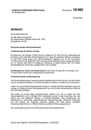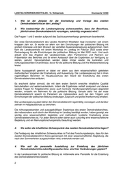LANDTAG NORDRHEIN-WESTFALEN - 18. Wahlperiode Drucksache 18/460 1. Wie ist der Zeitplan für die Erarbeitung und Vorlage des zweiten Demokratieberichts an den Landtag? 3. Wie beabsichtigt die Landesregierung sicherzustellen, dass der Beschluss, jährlich einen Demokratiebericht vorzulegen, zukünftig umgesetzt wird? Die Fragen 1 und 3 werden aufgrund des Sachzusammenhangs gemeinsam beantwortet. Der erste Demokratiebericht des Landes Nordrhein-Westfalen liegt inzwischen seit einem knappen Jahr vor. Er wurde vor allem von den Einrichtungen der politischen Bildung mit großem Interesse und dem Wunsch der vertieften Auseinandersetzung aufgenommen. Dem kam die Landeszentrale mit einem Workshop im Landtag im Februar 2022 sowie einer Partnertagung für alle Einrichtungen der politischen Bildung im Mai 2022 nach. Und auch aktuell wird das Angebot der Landeszentrale, allen Partnerinnen und Partnern zur Präsentation des Berichtes und für einen Austausch über die Ergebnisse zur Verfügung zu stehen, genutzt. Hervorgehoben werden dabei immer wieder die konkreten und richtungsweisenden Erkenntnisse, die er für die politische Bildung und ihre Weiterentwicklung leistet. Seine Aussagekraft gewinnt er dabei vor allem aus dem wissenschaftlich geleiteten methodischen Vorgehen der Erarbeitung und Auswertung. Die Landesregierung hat in ihren regelmäßigen Berichten im Hauptausschuss den Stand der Erarbeitung des ersten Demokratieberichtes erläutert. Es erscheint daher sinnvoll, die mit dem ersten Bericht erreichte inhaltliche Qualität beizubehalten und weiterzuentwickeln. Indem die Ergebnisse vertieft analysiert und daraus weitere Fragen für Folgeberichte sowie auch konkrete Handlungsempfehlungen abgeleitet werden, entsteht ein Mehrwert für die politische Bildung. Gerade dafür hat der erste Demokratiebericht sowohl im Parlament als insbesondere auch bei den Trägern und Einrichtungen der politischen Bildung eindeutigen Zuspruch und große Anerkennung erhalten. Die Landesregierung plant daher den Demokratiebericht regelmäßig vorzulegen und darüber zeitnah im Hauptausschuss zu berichten. Die richtungsweisenden und aussagekräftigen Ergebnisse des ersten Demokratieberichtes, die insbesondere auch durch den Workshop im Landtag bestätigt wurden, haben gezeigt, wie wichtig eine wissenschaftlich begleitete und methodisch fundierte Erarbeitung eines Demokratieberichtes ist. Für jeden Bericht sollen daher auch zukünftig eine wissenschaftliche Begleitung und ein Meinungsforschungsinstitut beauftragt werden. 2. Wo sollen die inhaltlichen Schwerpunkte des zweiten Demokratieberichts liegen? Die Festlegung des inhaltlichen Schwerpunktes ist Teil des Forschungsdesigns, dass für den zweiten Demokratiebericht in Kürze gemeinsam mit einer wissenschaftlichen Begleitung, die nach den Sommerferien ausgeschrieben wird, entwickelt werden soll. 4. Wie soll die personelle Ausstattung zur Erstellung des jährlichen Demokratieberichts zukünftig aussehen bzw. sind hier Veränderungen geplant? In der Landeszentrale für politische Bildung ist mittlerweile eine Planstelle für die Erstellung des Demokratieberichtes besetzt. 2