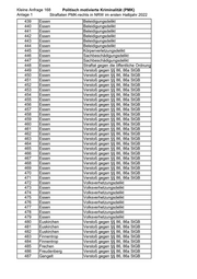 Kleine Anfrage 168 Politisch motivierte Kriminalität (PMK) Anlage 1 Straftaten PMK-rechts in NRW im ersten Halbjahr 2022 439 Essen Beleidigungsdelikt 440 Essen Beleidigungsdelikt 441 Essen Beleidigungsdelikt 442 Essen Beleidigungsdelikt 443 Essen Beleidigungsdelikt 444 Essen Beleidigungsdelikt 445 Essen Körperverletzungsdelikt 446 Essen Sachbeschädigungsdelikt 447 Essen Sachbeschädigungsdelikt 448 Essen Straftat gegen die öffentliche Ordnung 449 Essen Verstoß gegen §§ 86, 86a StGB 450 Essen Verstoß gegen §§ 86, 86a StGB 451 Essen Verstoß gegen §§ 86, 86a StGB 452 Essen Verstoß gegen §§ 86, 86a StGB 453 Essen Verstoß gegen §§ 86, 86a StGB 454 Essen Verstoß gegen §§ 86, 86a StGB 455 Essen Verstoß gegen §§ 86, 86a StGB 456 Essen Verstoß gegen §§ 86, 86a StGB 457 Essen Verstoß gegen §§ 86, 86a StGB 458 Essen Verstoß gegen §§ 86, 86a StGB 459 Essen Verstoß gegen §§ 86, 86a StGB 460 Essen Verstoß gegen §§ 86, 86a StGB 461 Essen Verstoß gegen §§ 86, 86a StGB 462 Essen Verstoß gegen §§ 86, 86a StGB 463 Essen Verstoß gegen §§ 86, 86a StGB 464 Essen Verstoß gegen §§ 86, 86a StGB 465 Essen Verstoß gegen §§ 86, 86a StGB 466 Essen Verstoß gegen §§ 86, 86a StGB 467 Essen Verstoß gegen §§ 86, 86a StGB 468 Essen Verstoß gegen §§ 86, 86a StGB 469 Essen Verstoß gegen §§ 86, 86a StGB 470 Essen Verstoß gegen §§ 86, 86a StGB 471 Essen Verstoß gegen §§ 86, 86a StGB 472 Essen Volksverhetzungsdelikt 473 Essen Volksverhetzungsdelikt 474 Essen Volksverhetzungsdelikt 475 Essen Volksverhetzungsdelikt 476 Essen Volksverhetzungsdelikt 477 Essen Volksverhetzungsdelikt 478 Essen Volksverhetzungsdelikt 479 Essen Volksverhetzungsdelikt 480 Euskirchen Verstoß gegen §§ 86, 86a StGB 481 Euskirchen Verstoß gegen §§ 86, 86a StGB 482 Euskirchen Verstoß gegen §§ 86, 86a StGB 483 Finnentrop Verstoß gegen §§ 86, 86a StGB 484 Finnentrop Verstoß gegen §§ 86, 86a StGB 485 Frechen Verstoß gegen §§ 86, 86a StGB 486 Freudenberg Verstoß gegen §§ 86, 86a StGB 487 Gangelt Verstoß gegen §§ 86, 86a StGB