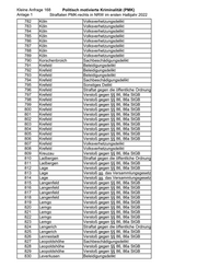 Kleine Anfrage 168 Politisch motivierte Kriminalität (PMK) Anlage 1 Straftaten PMK-rechts in NRW im ersten Halbjahr 2022 684 Kevelaer Verstoß gegen §§ 86, 86a StGB 685 Kierspe Verstoß gegen §§ 86, 86a StGB 686 Kirchhundem Verstoß gegen §§ 86, 86a StGB 687 Kleve Bedrohungs-/Nötigungsdelikt 688 Kleve Körperverletzungsdelikt 689 Kleve Verstoß gegen §§ 86, 86a StGB 690 Kleve Verstoß gegen §§ 86, 86a StGB 691 Kleve Verstoß gegen §§ 86, 86a StGB 692 Kleve Verstoß gegen §§ 86, 86a StGB 693 Kleve Verstoß gegen §§ 86, 86a StGB 694 Köln Bedrohungs-/Nötigungsdelikt 695 Köln Beleidigungsdelikt 696 Köln Beleidigungsdelikt 697 Köln Beleidigungsdelikt 698 Köln Beleidigungsdelikt 699 Köln Beleidigungsdelikt 700 Köln Beleidigungsdelikt 701 Köln Beleidigungsdelikt 702 Köln Beleidigungsdelikt 703 Köln Beleidigungsdelikt 704 Köln Beleidigungsdelikt 705 Köln Beleidigungsdelikt 706 Köln Beleidigungsdelikt 707 Köln Beleidigungsdelikt 708 Köln Körperverletzungsdelikt 709 Köln Körperverletzungsdelikt 710 Köln Körperverletzungsdelikt 711 Köln Körperverletzungsdelikt 712 Köln Körperverletzungsdelikt 713 Köln Körperverletzungsdelikt 714 Köln Körperverletzungsdelikt 715 Köln Körperverletzungsdelikt 716 Köln Sachbeschädigungsdelikt 717 Köln Sachbeschädigungsdelikt 718 Köln Sachbeschädigungsdelikt 719 Köln Sachbeschädigungsdelikt 720 Köln Sonstiges Delikt 721 Köln Sonstiges Delikt 722 Köln Verstoß gegen §§ 86, 86a StGB 723 Köln Verstoß gegen §§ 86, 86a StGB 724 Köln Verstoß gegen §§ 86, 86a StGB 725 Köln Verstoß gegen §§ 86, 86a StGB 726 Köln Verstoß gegen §§ 86, 86a StGB 727 Köln Verstoß gegen §§ 86, 86a StGB 728 Köln Verstoß gegen §§ 86, 86a StGB 729 Köln Verstoß gegen §§ 86, 86a StGB 730 Köln Verstoß gegen §§ 86, 86a StGB 731 Köln Verstoß gegen §§ 86, 86a StGB 732 Köln Verstoß gegen §§ 86, 86a StGB