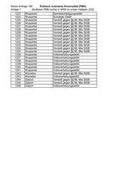 Kleine Anfrage 168 Politisch motivierte Kriminalität (PMK) Anlage 1 Straftaten PMK-rechts in NRW im ersten Halbjahr 2022 1174 Warendorf Verstoß gegen §§ 86, 86a StGB 1175 Warstein Verstoß gegen §§ 86, 86a StGB 1176 Wassenberg Sachbeschädigungsdelikt 1177 Wassenberg Verstoß gegen §§ 86, 86a StGB 1178 Wassenberg Verstoß gegen §§ 86, 86a StGB 1179 Wegberg Verstoß gegen §§ 86, 86a StGB 1180 Wegberg Verstoß gegen §§ 86, 86a StGB 1181 Wegberg Verstoß gegen §§ 86, 86a StGB 1182 Weilerswist Beleidigungsdelikt 1183 Weilerswist Verstoß gegen §§ 86, 86a StGB 1184 Weilerswist Volksverhetzungsdelikt 1185 Werl Verstoß gegen §§ 86, 86a StGB 1186 Werl Verstoß gegen §§ 86, 86a StGB 1187 Werl Verstoß gegen §§ 86, 86a StGB 1188 Werl Verstoß gegen §§ 86, 86a StGB 1189 Wermelskirchen Verstoß gegen §§ 86, 86a StGB 1190 Werne Verstoß gegen §§ 86, 86a StGB 1191 Werne Verstoß gegen §§ 86, 86a StGB 1192 Wesel Körperverletzungsdelikt 1193 Wesel Sonstiges Delikt 1194 Wesel Verstoß gegen §§ 86, 86a StGB 1195 Wesel Verstoß gegen §§ 86, 86a StGB 1196 Wesseling Bedrohungs-/Nötigungsdelikt 1197 Wesseling Beleidigungsdelikt 1198 Wesseling Verstoß gegen §§ 86, 86a StGB 1199 Wickede Verstoß gegen §§ 86, 86a StGB 1200 Wiehl Verstoß gegen §§ 86, 86a StGB 1201 Willich Verstoß gegen §§ 86, 86a StGB 1202 Windeck Verstoß gegen §§ 86, 86a StGB 1203 Windeck Verstoß gegen §§ 86, 86a StGB 1204 Winterberg Verstoß gegen §§ 86, 86a StGB 1205 Wipperfürth Verstoß gegen §§ 86, 86a StGB 1206 Witten Körperverletzungsdelikt 1207 Witten Körperverletzungsdelikt 1208 Witten Sachbeschädigungsdelikt 1209 Witten Sachbeschädigungsdelikt 1210 Witten Verstoß gegen §§ 86, 86a StGB 1211 Witten Verstoß gegen §§ 86, 86a StGB 1212 Witten Verstoß gegen §§ 86, 86a StGB 1213 Witten Verstoß gegen §§ 86, 86a StGB 1214 Wülfrath Beleidigungsdelikt 1215 Wülfrath Volksverhetzungsdelikt 1216 Wuppertal Bedrohungs-/Nötigungsdelikt 1217 Wuppertal Bedrohungs-/Nötigungsdelikt 1218 Wuppertal Beleidigungsdelikt 1219 Wuppertal Beleidigungsdelikt 1220 Wuppertal Beleidigungsdelikt 1221 Wuppertal Beleidigungsdelikt 1222 Wuppertal Beleidigungsdelikt
