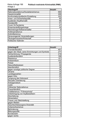 Kleine Anfrage 168 Politisch motivierte Kriminalität (PMK) Anlage 2 Oberbegriff Anzahl Nationalsozialismus/Sozialdarwinismus 890 Hasskriminalität 406 Konfrontation/politische Einstellung 322 Innen- und Sicherheitspolitik 90 Ausländer-/Asylthematik 66 Sozialpolitik 51 Covid-19-Pandemie 47 Krisenherde/Bürgerkriege 30 Reichsbürger/Selbstverwalter 9 Antiimperialismus 1 Antimilitarismus 1 Herausragende Veranstaltungen 1 Ökologie/Industrie/Wirtschaft 1 Politischer Kalender 1 Unterbegriff Anzahl Fremdenfeindlich 401 gegen den Staat, seine Einrichtungen und Symbole 277 Verherrlichung / Propaganda 219 Ausländerfeindlich 198 Rassismus 151 Antisemitisch 102 Polizei 60 Gesundheitswesen 49 Islamfeindlich 38 gegen sonstige politische Gegner 36 Ukraine 30 Landtagswahlen 26 gegen links 20 Leugnung des Holocaust 17 Sexuelle Orientierung 10 Antiziganistisch 5 Justiz 5 Völkischer Nationalismus 5 Frauenfeindlich 3 Totalitarismus / "Führerprinzip" 3 Unterbringung von Asylbewerbern 3 Abschiebung 2 Alimentation 2 Frauen und Gleichstellung 2 gegen Medien 2 Geschlechtsbezogene Diversität 2 Antiamerikanismus 1 Behinderung 1 Bildungspolitik 1 Bundeswehr 1 gegen rechts 1