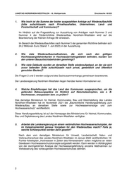 LANDTAG NORDRHEIN-WESTFALEN - 18. Wahlperiode Drucksache 18/553 1. Wie hoch ist die Summe der bisher ausgezahlten Anträge auf Wiederaufbauhilfe (bitte aufschlüsseln nach Privathaushalten, Unternehmen, Land- und Forstwirtschaft und Kommunen)? Im Hinblick auf die Fragestellung zur Auszahlung von Anträgen nach Nummer 3 und Nummer 4 der Förderrichtlinie Wiederaufbau Nordrhein-Westfalen wird auf die Beantwortung der Kleinen Anfrage 89 verwiesen. Im Bereich der Wiederaufbauhilfen nach Nummer 5 der genannten Richtlinie befinden sich 24,2 Millionen Euro (Stand: 1. Juli 2022) in der Auszahlung. 2. Wie viele Wiederaufbaumaßnahmen, die sich nach den gültigen Hochwassergefahrenkarten in Hochwasserrisikogebieten befinden, wurden von den unteren Bauaufsichtsbehörden genehmigt? 3. Wie viele Gebäude wurden an derselben Stelle wiederaufgebaut, an der sie sich zuvor befanden (bitte aufschlüsseln nach privat, gewerblich und öffentlich genutzten Bauten)? Die Fragen 2 und 3 werden aufgrund des Sachzusammenhangs gemeinsam beantwortet. Der Landesregierung Nordrhein-Westfalen liegen hierüber keine Informationen vor. 4. Welche Empfehlungen hat das Land den Kommunen ausgesprochen, um die geltenden Bebauungspläne im Hinblick auf Naturkatastrophen, wie z. B. Hochwasser, anzupassen bzw. zu prüfen? Das damalige Ministerium für Heimat, Kommunales, Bau und Gleichstellung des Landes Nordrhein-Westfalen hat im November 2021 die „Baurechtliche Handlungsanleitung zum Wiederaufbau an derselben Stelle sowie zur Hochwasservorsorge und zum Hochwasserschutz“ veröffentlicht. Diese Handlungsanleitung ist auf der Homepage des Ministeriums für Heimat, Kommunales, Bau und Digitalisierung des Landes Nordrhein-Westfalen verfügbar. 5. Arbeitet die Landesregierung an einem verbindlichen Hochwasserschutzplan, der im Katastrophenfall genaue Vorgaben für den Wiederaufbau macht? Falls ja, welche Schwerpunkte werden darin gesetzt? Nach dem vom damaligen Ministerium für Umwelt, Landwirtschaft, Natur- und Verbraucherschutz des Landes Nordrhein-Westfalen im Januar 2022 veröffentlichten 10- Punkte-Arbeitsplan „Hochwasser in Zeiten des Klimawandels“ sollen möglichst an vielen Gewässern Hochwasserschutzkonzepte aufgestellt werden. Darin werden in Abhängigkeit von der durchgeführten Analyse der Hochwassergefährdung einzelne Maßnahmen zur Verbesserung des vorbeugenden Hochwasserschutzes definiert. 2