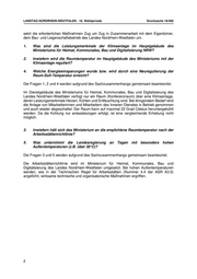 LANDTAG NORDRHEIN-WESTFALEN - 18. Wahlperiode Drucksache 18/466 setzt die erforderlichen Maßnahmen Zug um Zug in Zusammenarbeit mit dem Eigentümer, dem Bau- und Liegenschaftsbetrieb des Landes Nordrhein-Westfalen um. 1. Was sind die Leistungsmerkmale der Klimaanlage im Hauptgebäude des Ministeriums für Heimat, Kommunales, Bau und Digitalisierung NRW? 2. Inwiefern wird die Raumtemperatur im Hauptgebäude des Ministeriums mit der Klimaanlage reguliert? 4. Welche Energieeinsparungen wurde bzw. wird durch eine Neuregulierung der Raum-Soll-Temperatur erreicht? Die Fragen 1, 2 und 4 werden aufgrund des Sachzusammenhangs gemeinsam beantwortet. Im Dienstgebäude des Ministeriums für Heimat, Kommunales, Bau und Digitalisierung des Landes Nordrhein-Westfalen verfügt nur ein Raum (Konferenzraum) über eine Klimaanlage, deren Leistungsmerkmale Heizen, Kühlen und Entfeuchtung sind. Bei dringendem Bedarf wird die Anlage von Mitarbeiterinnen und Mitarbeitern des Inneren Dienstes in Betrieb genommen und auch wieder abgeschaltet. Der Raum kann auf maximal 22 Grad Celsius heruntergekühlt werden. Da die Kühlung nur anlassbezogen erfolgt, ist eine vergleichende Erhebung nicht möglich. 3. Inwiefern hält sich das Ministerium an die empfohlene Raumtemperatur nach der Arbeitsstättenrichtlinie? 5. Was unternimmt die Landesregierung an Tagen mit besonders hohen Außentemperaturen (z.B. über 30°C)? Die Fragen 3 und 5 werden aufgrund des Sachzusammenhangs gemeinsam beantwortet. Die Arbeitsstättenrichtlinie wird im Ministerium für Heimat, Kommunales, Bau und Digitalisierung des Landes Nordrhein-Westfalen umgesetzt. Bei hohen Außentemperaturen werden, wie in der Technischen Regel für Arbeitsstätten (Nummer 4.4 der ASR A3.5) angeführt, wirksame technische und organisatorische Maßnahmen ergriffen. 2