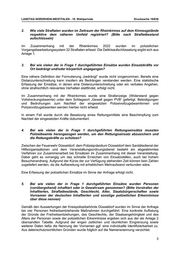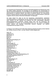 LANDTAG NORDRHEIN-WESTFALEN - 18. Wahlperiode Drucksache 18/636 2. Wie viele Straftaten wurden im Zeitraum der Rheinkirmes auf dem Kirmesgelände respektive dem näheren Umfeld registriert? (Bitte nach Straftatbestand aufschlüsseln) Im Zusammenhang mit der Rheinkirmes 2022 wurden im polizeilichen Vorgangsbearbeitungssystem 32 Straftaten erfasst. Die Deliktsaufschlüsselung ergibt sich aus Anlage 1. 3. Bei wie vielen der in Frage 1 durchgeführten Einsätze wurden Einsatzkräfte vor Ort bedrängt und/oder körperlich angegangen? Eine nähere Definition der Formulierung „bedrängt“ wurde nicht vorgenommen. Bereits eine Distanzunterschreitung kann insofern als Bedrängen verstanden werden. Eine statistische Erfassung der Einsätze, in denen eine Distanzunterschreitung oder ein verbales Angehen, ohne strafrechtlich relevantes Verhalten stattfindet, erfolgt nicht. Im Zusammenhang mit der Rheinkirmes wurde eine Strafanzeige (Widerstand gegen Vollstreckungsbeamte) unter dem Schlagwort „Gewalt gegen PVB“ gefertigt. Beleidigungen und Bedrohungen zum Nachteil der eingesetzten Polizeivollzugsbeamtinnen und Polizeivollzugsbeamten werden hierbei nicht erfasst. In einem Fall wurde durch die Besatzung eines Rettungsmittels eine Beschimpfung zum Nachteil der eingesetzten Kräfte dokumentiert. 4. Bei wie vielen der in Frage 1 durchgeführten Rettungseinsätze mussten Polizeibeamte herangezogen werden, um den Rettungseinsatz abzusichern und die Rettungskräfte zu schützen? Zwischen der Feuerwehr Düsseldorf, dem Polizeipräsidium Düsseldorf dem Sanitätsdienst der Hilfsorganisationen und dem Veranstaltungsordnungsdienst besteht ein abgestimmtes Verfahren zur Zusammenarbeit bei Einsätzen im Zusammenhang mit dieser Veranstaltung. Dabei geht es vorrangig um das schnelle Erreichen von Einsatzstellen, auch bei hohem Besucherandrang. Aufgrund der Kürze der zur Verfügung stehenden Zeit können kein Zahlen zugeliefert werden, da die Aufbereitung mit erheblichem Mehraufwand verbunden wäre. Eine Erfassung der polizeilichen Einsätze im Sinne der Anfrage erfolgt nicht. 5. Bei wie vielen der in Frage 1 durchgeführten Einsätze wurden Personen (vorübergehend) inhaftiert oder in Gewahrsam genommen? (Bitte Vorstrafen der Inhaftierten, Straftatbestände, Geschlecht, Alter, Staatsbürgerschaften sowie Vornamen der deutschen Inhaftierten und sonstige polizeilichen Erkenntnisse über diese nennen) Gemäß den Auswertungen der Kreispolizeibehörde Düsseldorf wurden im Sinne der Anfrage bei vier Personen freiheitsentziehende Maßnahmen durchgeführt. Eine konkrete Auflistung der Gründe der Freiheitsentziehungen, des Geschlechts, der Staatsangehörigkeit und des Alters der Personen sowie der polizeilichen Erkenntnisse ergeben sich aus der als Anlage 2 übersandten Tabelle. Aufgrund der engen zeitlichen und räumlichen Eingrenzung sowie weiterer Daten ließe die Nennung der Vornamen ggf. eine individuelle Identifizierbarkeit zu. Aus datenschutzrechtlichen Gründen wurde folglich auf die Namensnennung verzichtet. 3