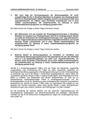 LANDTAG NORDRHEIN-WESTFALEN - 18. Wahlperiode Drucksache 18/522 3. Wie hoch liegt die Versorgungsquote der Betreuungsplätze für nicht- schulpflichtige Kinder in Nordrhein-Westfalen im Vergleich zum Kindergartenjahr 2021/22 im Kindergartenjahr 2022/23 (Angaben absolut und prozentual, bitte nach Jugendamtsbezirk, U3- Plätzen sowie Ü3-Plätzen aufschlüsseln und in einer Tabelle zusammengefasst, die medienbruchfrei zur Nutzung in einem Tabellenkalkulationsprogramm zur Verfügung gestellt wird)? Die Daten können der Anlage zu dieser Frage entnommen werden. 4. Wie differenziert sich das Angebot der Kindertageseinrichtungen in Nordrhein- Westfalen im Vergleich zum Kindergartenjahr 2021/22 im Kindergartenjahr 2022/23 aus (bitte die Gesamtzahl der Kindertageseinrichtungen nach Jugendamtsbezirk, Art der Trägerschaft [kommunal/kirchlich/freie Träger/Elterninitiative] und Anzahl betreuter Kinder aufschlüsseln und in einer Tabelle zusammengefasst, die medienbruchfrei zur Nutzung in einem Tabellenkalkulationsprogramm zur Verfügung gestellt wird)? Die Daten können der Anlage zu dieser Frage entnommen werden. 5. Welchen Bedarf an Betreuungsplätzen im Verhältnis im Verhältnis zum Tatsächlichen Betreuungsangebot weisen die Jugendämter für das Jahr 2022/2023 nach § 4 (2) Kinderbildungsbesetz aus (bitte nach Jugendamtsbezirken, U3- Kindern sowie Ü3-Kindern aufschlüsseln und in einer Tabelle zusammengefasst, die medienbruchfrei zur Nutzung in einem Tabellenkalkulationsprogramm zur Verfügung gestellt wird)? Gemäß § 4 Kinderbildungsgesetz (KiBiz) sind die Träger der öffentlichen Jugendhilfe (Jugendämter) unter Einbeziehung der Träger der freien Jugendhilfe verpflichtet, ein bedarfsgerechtes Betreuungsangebot in Kindertageseinrichtungen und der Kindertagespflege zu entwickeln (vgl. auch § 80 Absatz 1 Achtes Buch Sozialgesetzbuch). Hierzu haben die Jugendämter gemäß § 4 Absatz 2 KiBiz, in eigener Zuständigkeit, einen Bedarfsplan für ihren Bezirk zu erstellen. Der Bedarfsplan wird jährlich fortgeschrieben. Er weist die zur Bedarfsdeckung betriebsgenehmigten Plätze in Kindertageseinrichtungen und der Kindertagespflege und die zur Realisierung eines bedarfsgerechten Angebots voraussehbare Entwicklung aus. Gemäß § 4 Absatz 3 KiBiz sollen die Jugendämter das Angebot an den Bedarfen der Familien ausrichten, daher sollen gemäß Absatz 4 neben demografischen Modellrechnungen oder anderen Verfahren auch Befragungen von Eltern erfolgen. Da die Ermittlung der örtlichen Bedarfe und der gesamten Jugendhilfeplanung der ausschließlichen Zuständigkeit und Gesamtverantwortung des jeweiligen Jugendamtes unterfällt (vgl. §§ 79, 80 Achtes Buch Sozialgesetzbuch), liegen der Landesregierung hierzu keine Daten vor. 2