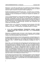 LANDTAG NORDRHEIN-WESTFALEN - 18. Wahlperiode Drucksache 18/641 3. Für wie sinnvoll erachtet die nordrhein-westfälische Landesregierung die geänderte Datenschutzrichtlinie in Berlin inhaltlich? Die Landesregierung bewertet die datenschutzrechtliche Praxis anderer Bundesländer nicht. 4. Plant die nordrhein-westfälische Landesregierung ebenfalls eine solche (o. ä.) Änderung des bestehenden Datenschutzes zwecks Einschränkung von Datenübermittlungen an Opferhilfe- und Beratungsstellen? Nein. 3