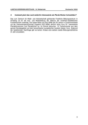 LANDTAG NORDRHEIN-WESTFALEN - 18. Wahlperiode Drucksache 18/644 5. Inwieweit plant das Land weiterhin Interessierte als Pferde-Rücker fortzubilden? Das zum Zentrum für Wald- und Holzwirtschaft gehörende Forstliche Bildungszentrum in Arnsberg ist für die Aus- und Weiterbildung der Akteure der nordrhein-westfälischen Forstwirtschaft zuständig. Dort bietet Wald und Holz NRW seit 30 Jahren in Zusammenarbeit mit der Interessengemeinschaft Zugpferd (IGZ NRW) jährlich einen Kurs für interessierte Pferdeführerinnen und Pferdeführer an. Im Schnitt besuchen 12 Teilnehmende aus dem ganzen Bundesgebiet und dem benachbarten europäischen Ausland diesen Kurs. Aufgrund der bestehenden Nachfrage gibt es keinen Anlass eine weitere zweite Bildungsmaßnahme im Jahr anzubieten. 3